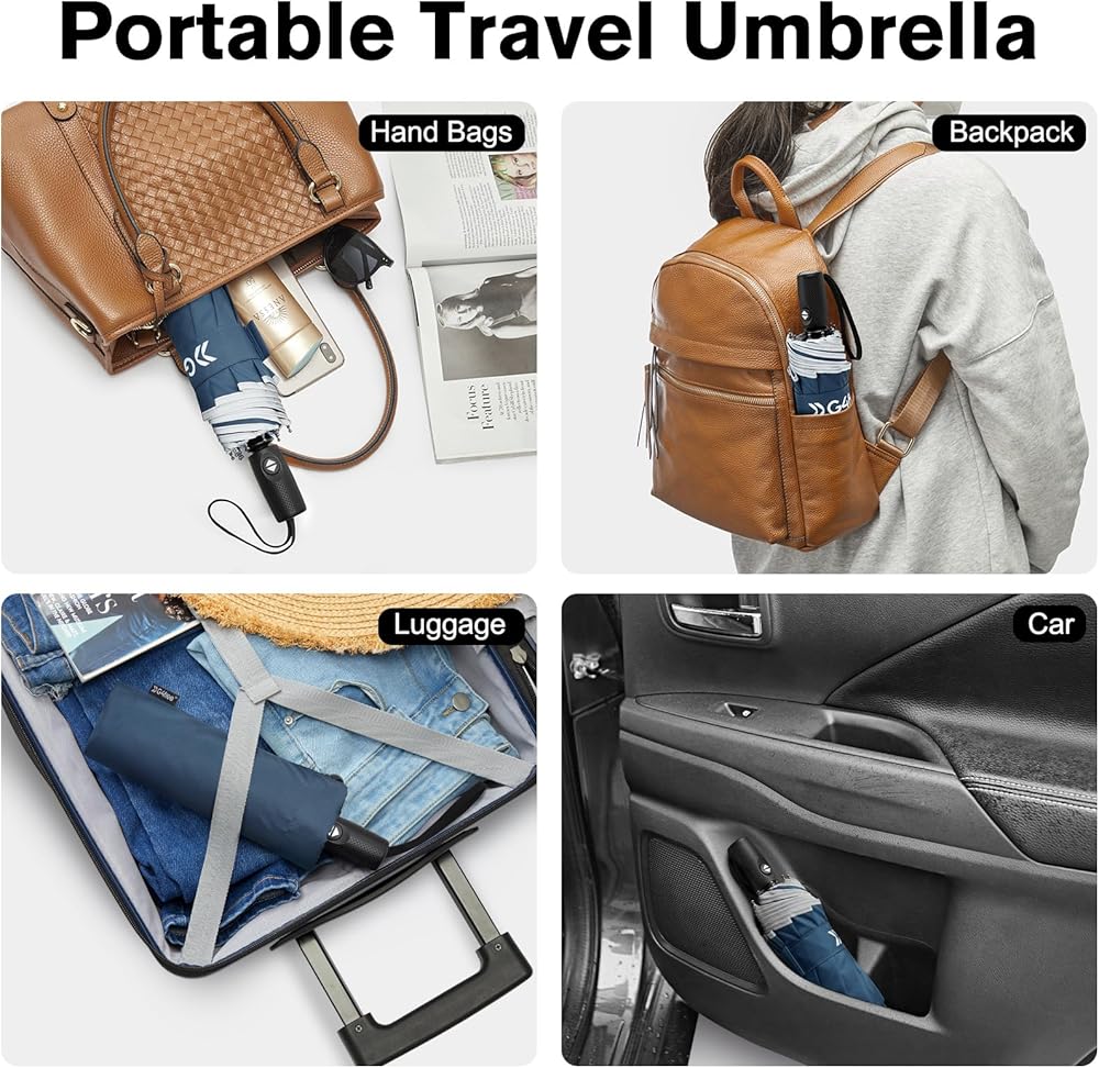 【Easy one-handed use, Small & Portable】With the push of a button, you can automatically open or close your G4Free umbrella. It can provide a huge coverage of 42 inches, is only 11 by 2.75 inches in size, and weighs less than 1 lb. The portable umbrella fits perfectly in your backpack, purse, or car door. You can take the compact umbrella with you wherever you go.