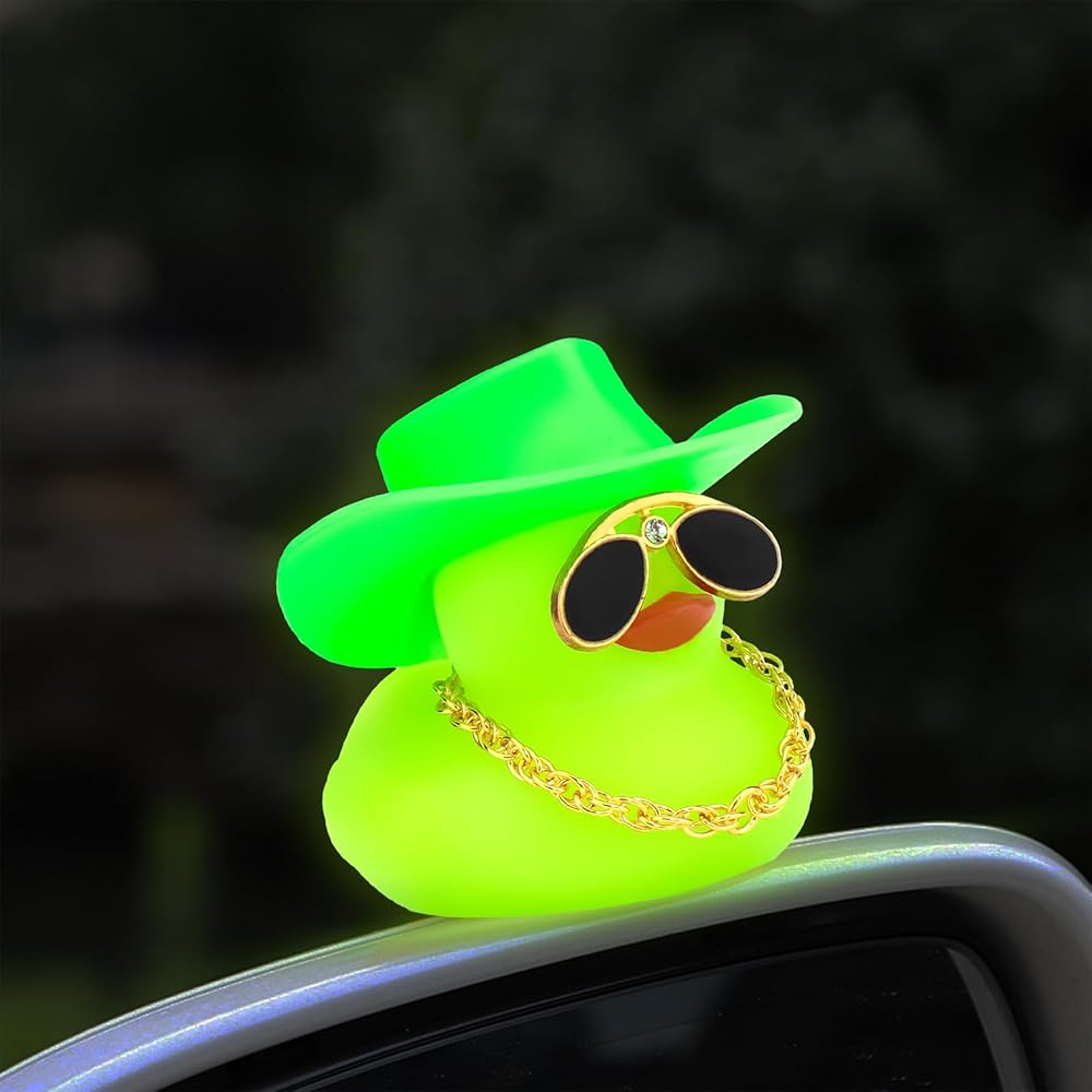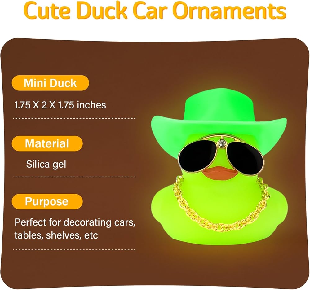Package: One package includes a mini green rubber duck, a green cowboy hat, a gold chain, a classic black sunglasses, double-sided tapes.Use the tape to fix the hat on the duck's head, if it's not working or anything missing, please let us know, we will help you solve it.