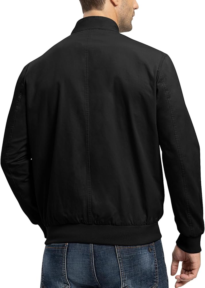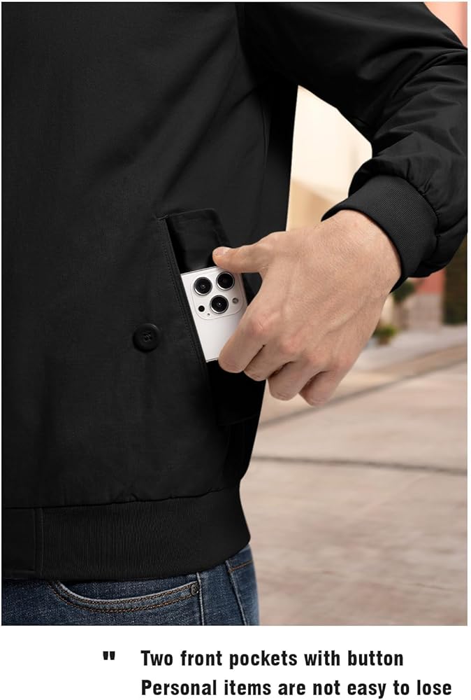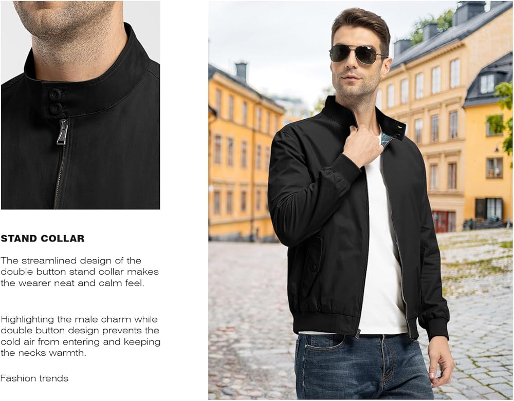 The cotton lightweight windbreaker jacket, double button stand collar design, full zip closure, two functional pockets and an inner pocket allows you to safely store your phone, wallet, parking pass, and other items. Elastic ribbed cuffs and hem with high elasticity, prevent cold wind from entering and it doesn't bind your body. All are designed to minimize heat loss from the human body.