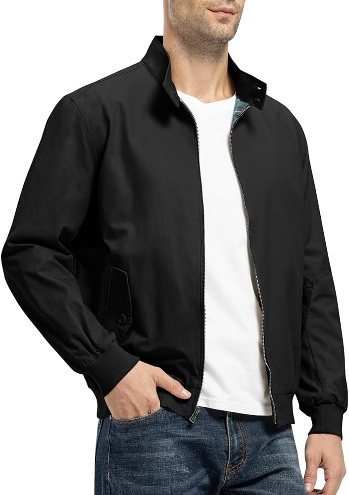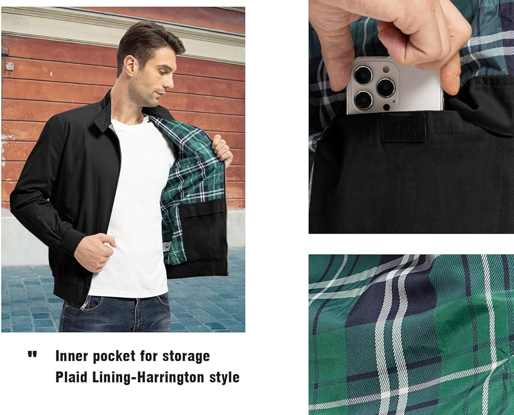 This men's bomber jacket features Harrington's style elements- Plaid Lining, classic and stylish. Pair it with simple jeans and a plain white T-shirt for you look modern and casual.