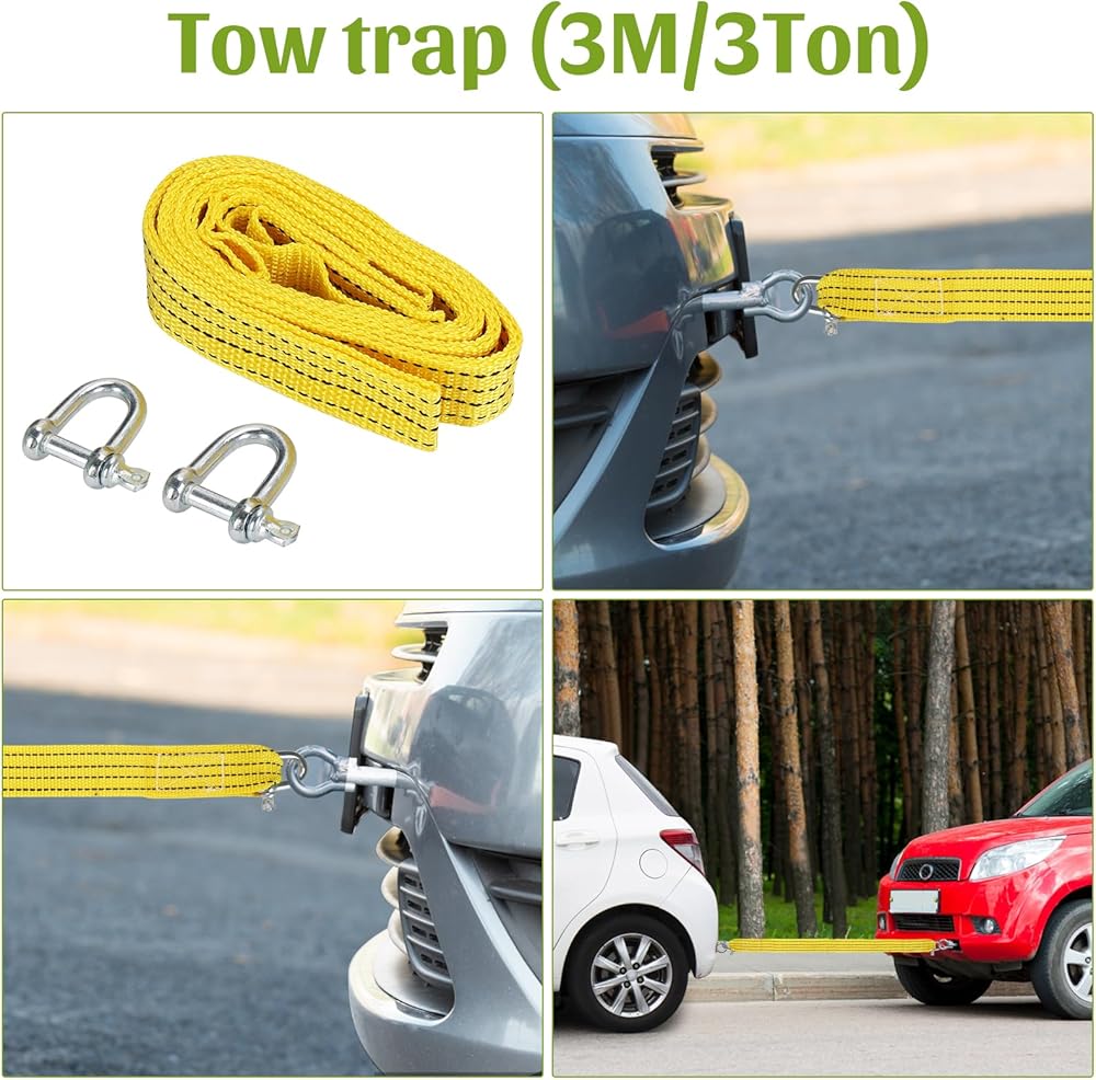 Package includes: Disposable raincoat, Jumper Cables, Gloves, Multi functional emergency hammer , Warning sign, Tow trap (3M/3Ton), Emergency bag, Reflective vest, Multi functional shovel, Electric tape, Oil suction pipe, Tire pressure, Safety Fuse.