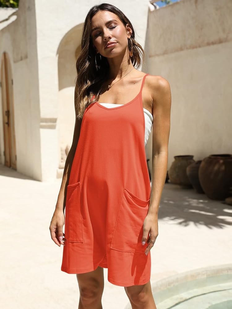 [Eyecatching Features] It is a deep V neck and sleeveless romper in attractive plain solid color with 2 side pockets. The spaghetti straps allow you to adjust the dress as per your comfort. Makes you look attractive and feels comfortable.