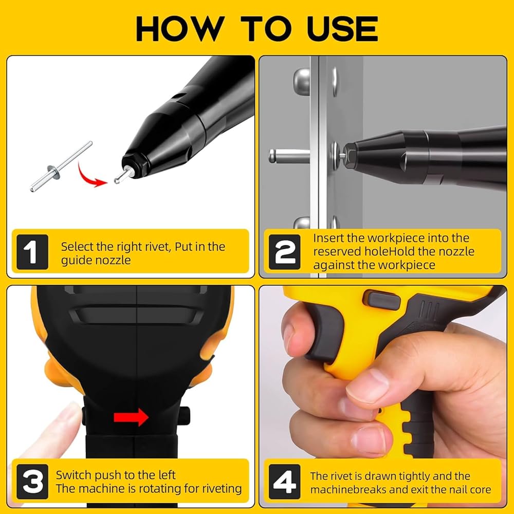 Compatible with Three Sizes of Rivets : The cordless rivet tool rivet gun capable of pulling rivets with 3/16 inch (4.8 mm), 5/32 inch (4 mm), and 1/8 inch (3.2 mm) sizes, 3 seconds of fast riveting. Suitable for aluminum nails, steel ails. this rivet gun finds utility in industrial manufacturing, renovation projects, machinists, metal workers, automotive and construction assemblers, and more.