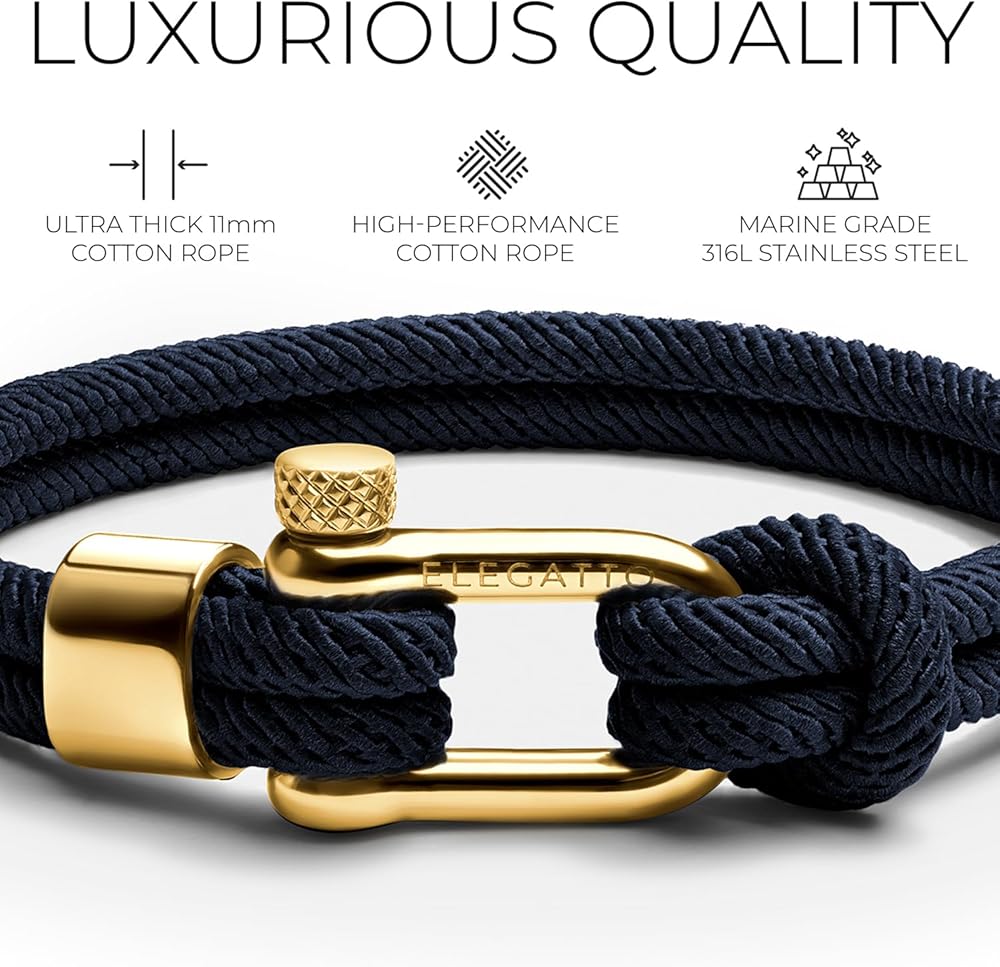 Sophisticated Nautical Design: The navy double-strand cord, knotted around the gold-plated hardware, creates an elegant and bold look suitable for both casual and formal wear.
