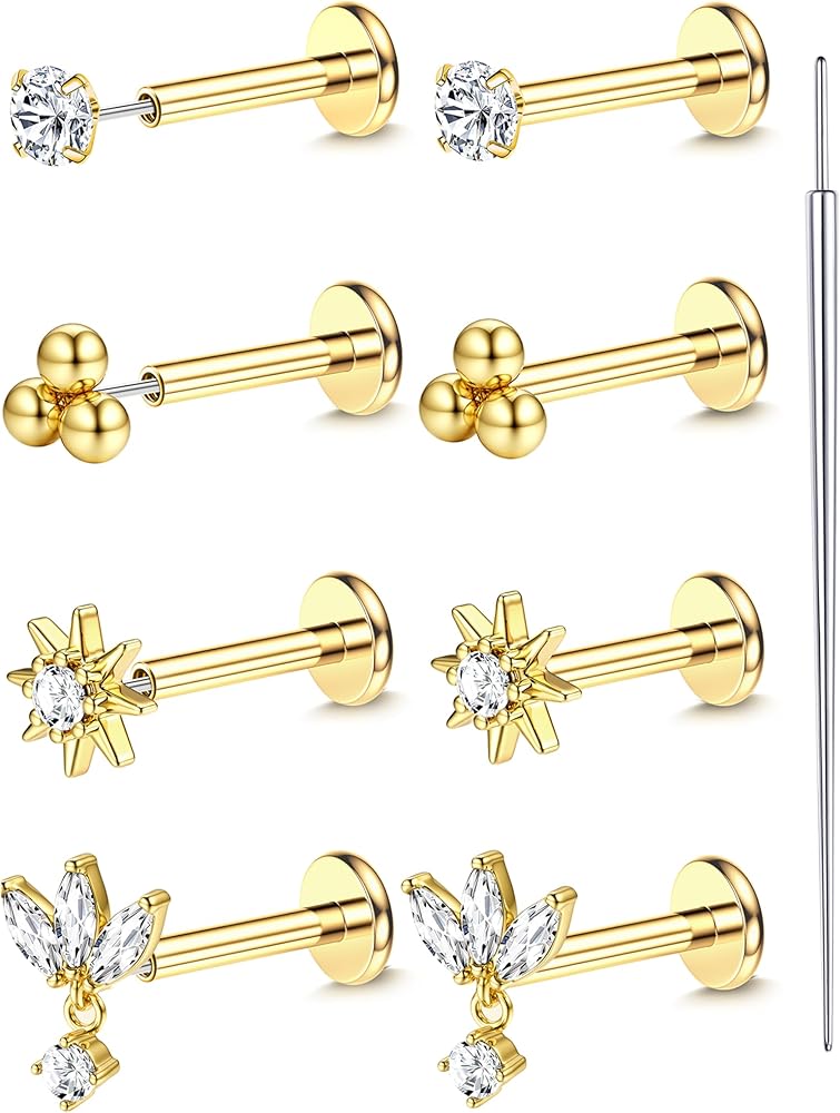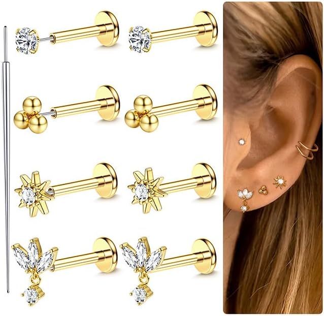 Threadless Flat Back Earrings Set:1 order you will get 4 pairs push in flat back earrings studs ,2pcs 8mm hoops and 1pcs of straight piercing taper.Piercing Stud Gauge Size: 16G(1.2mm)/18G(1.0mm)/20G(0.8mm) Bar Length: 6mm/7mm/8mm,meet your different needs.Color: silver/18K gold.AAAAAA+ cubic zirconia,which is staying securely set, Long-lasting shine.Dainty tiny stud earrings are suitable for most women and men.EACH POST FITS ALL THESE THREAD TOP