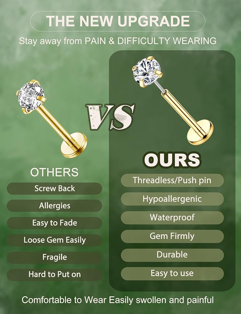 Easy to Wear --Threadless Push in design,compared to traditional threaded Flat Back styles, you only need to move your fingers to put the ear piercing jewelry on and take off in one second. No more screw anything behind your ears,and you don't have to worry about the threads scratching your sensitive skin.These nap flatback earrings offer convenience and comfort, ensuring a comfortable experience even during sleep, sports activities, daily activities,or showers