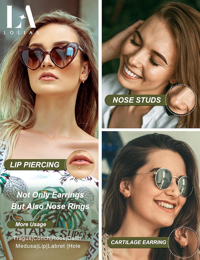 Multiple Uses:Not only earrings studs, but also nose studs,These 16 gauge body piercing jewelry can be used as cartilage earring stud/helix earrings/daith conch piercing jewelry/tragus earrings for women,and lip rings stud / Labret medusa piercing jewelry.18 gauge and 20 gauge is more suitable for your nose piercing and most ear piercings,They can be worn in different parts of the ear.Wear it, whether it is usually or party, you will be the most shining focus