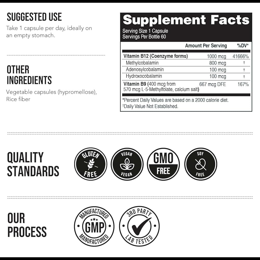 Full-Spectrum Vitamin B12 - Plus Methyl Folate Cofactor: Methylcobalamin, Adenosylcobalamin & Hydroxocobalamin are the 3 most beneficial forms of Vitamin B12, with each having differing functions in the body. They are naturally occurring, biologically active, coenzyme forms of vitamin B12; they are the forms the body needs for cellular utilization. The formula also provides a full serving of L-Methylfolate which is an essential cofactor of B12.