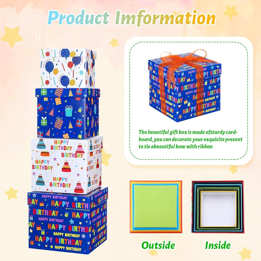 Size: gift boxes: about 6.5 x 6.5 x 5.7 inches/ 16.5 x 16.5 x 14.5 cm. 5.9 x 5.9 x 5.3 inches/ 15 x 15 x 13.5 cm. 5.3 x 5.3 x 4.9 inches/ 13.5 x 13.5 x 12.5 cm. 4.7 x 4.7 x 3.9 inches/ 12 x 12 x 10 cm(L x W x H)