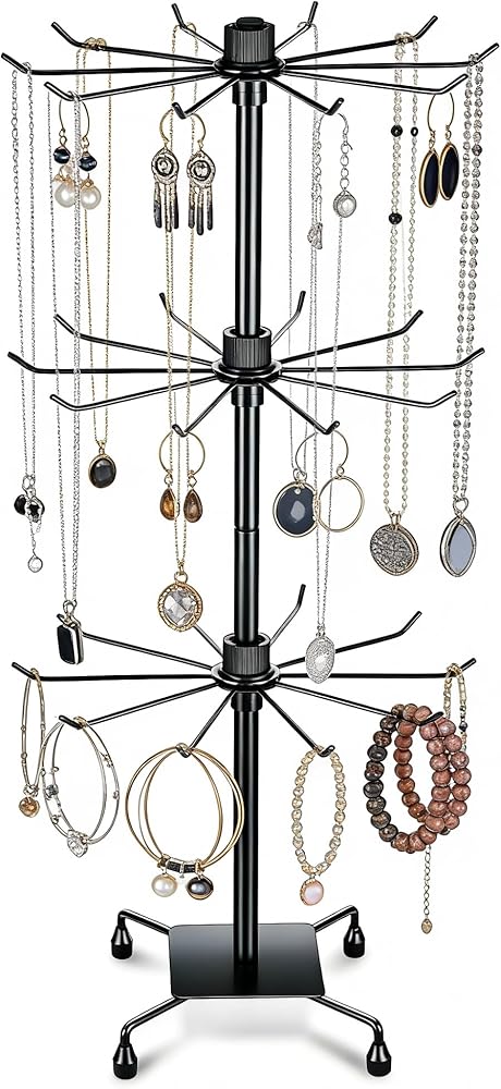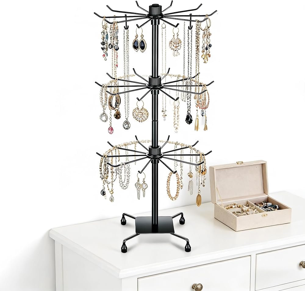 3 TIER ROTATING DISPLAY RACK: The jewelry display stand has 3 tiers and can hold 80 to 100 Necklaces, Bracelets, Earrings or Rings.