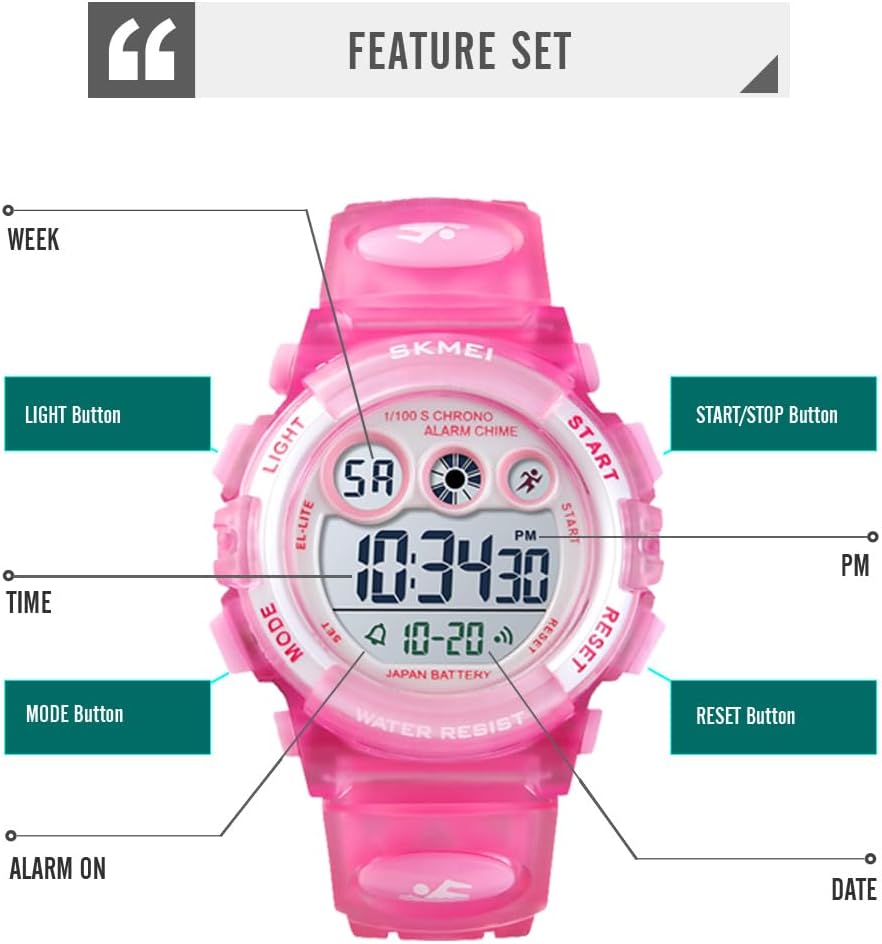 Multi-function kid digital watch: LED backlight, alarm, chronograph, stopwatch timer, High quality electronic movement with Japanese battery. these features make this boy's digital watch suitable for all kinds of indoor and outdoor sports.