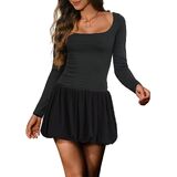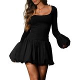 [Bubble Dress] - This bubble mini dress features scoop neckline, gathered skirt with bubble hem, fitted fit long sleeve top, pull over design, above knee length, full lined, mini puff dress, bubble dresses for women, casual mini dress.