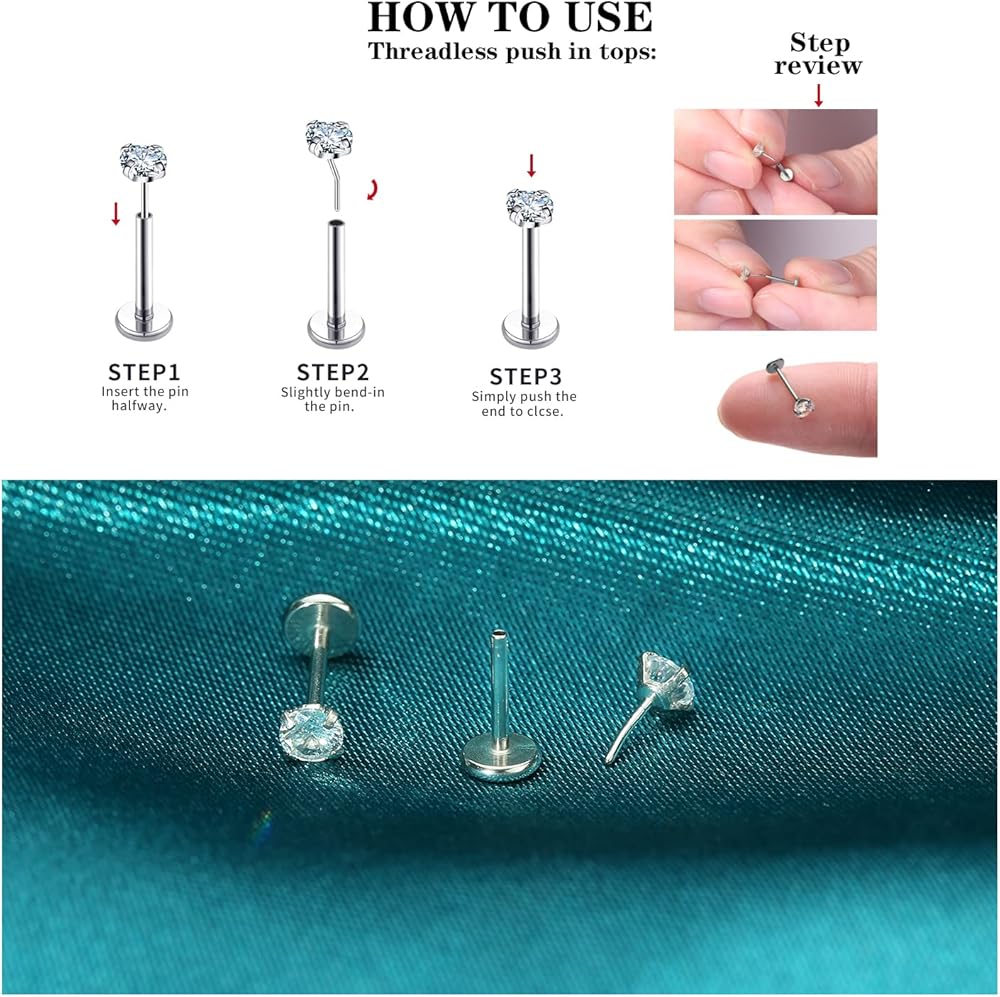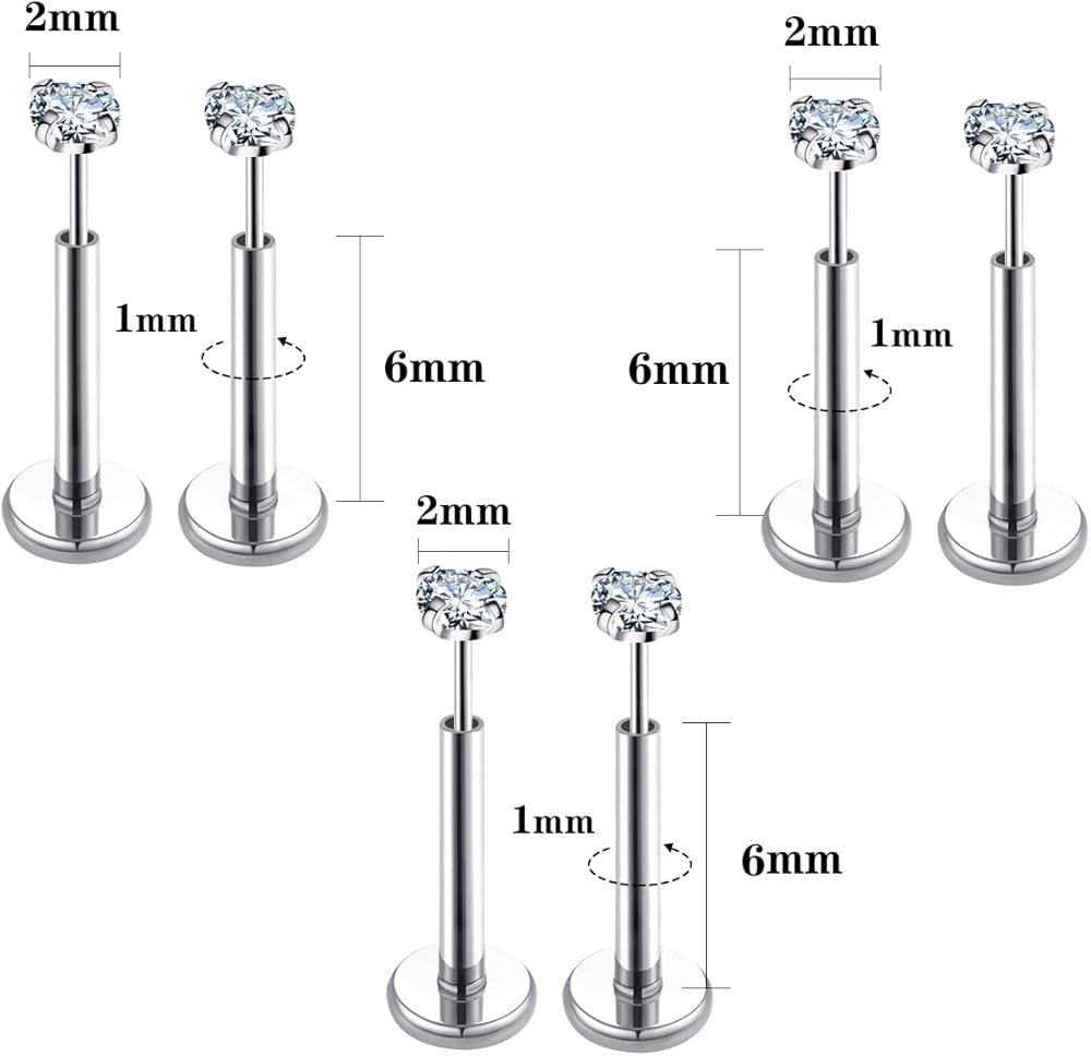 ♥Easy Operation♥: You'll love the flexibility,the threadless long push pin design is easy to put in/take out.Labret tragus cartilage lip rings stud snap studs earrings dainty gauge:18G,bar length:6/6/8mm,CZ dia.:2/3/4mm.You can wear different sizes in different parts.