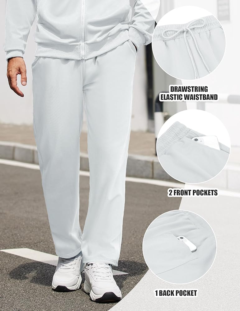 MEN'S SPORTS OUTFITS -Straight leg pants delicate elastic waist with drawstring for adjustable fit; Two front pockets and 1 back pocket.This jogging pants design make running suit wear comfortable and safty.