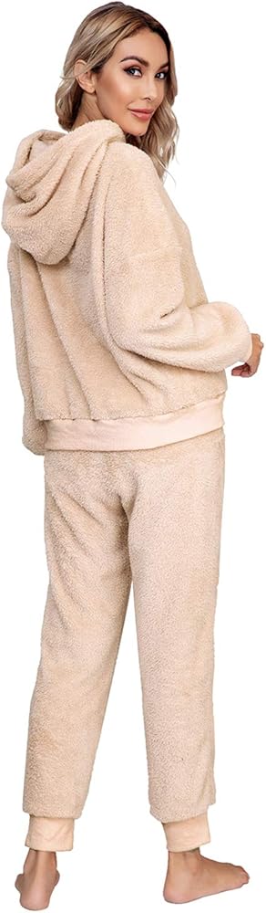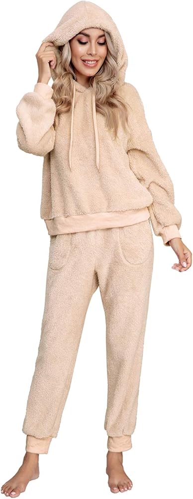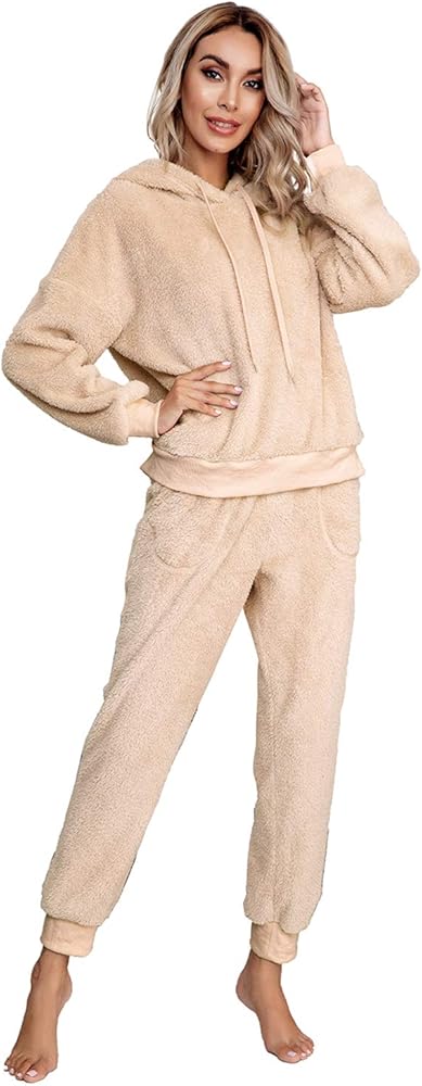 ★Womens Fuzzy Sherpa Fleece Pajamas Set, Long Sleeve Hoodies Pajama Pants 2 Piece Outfits Loungewear Sleepwear Nightwear★