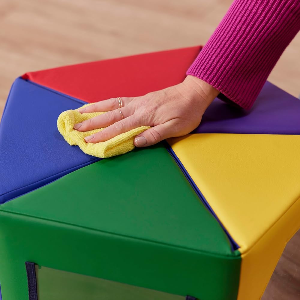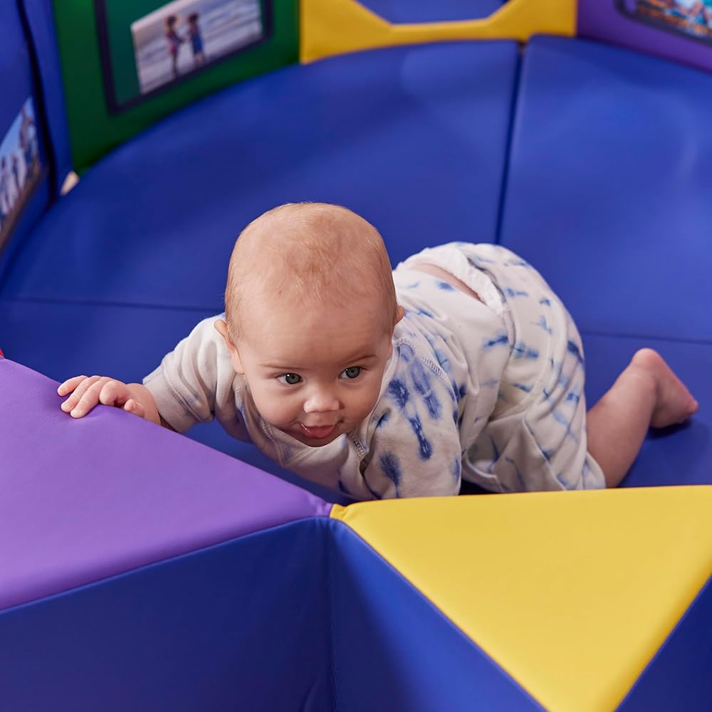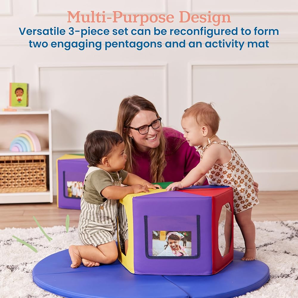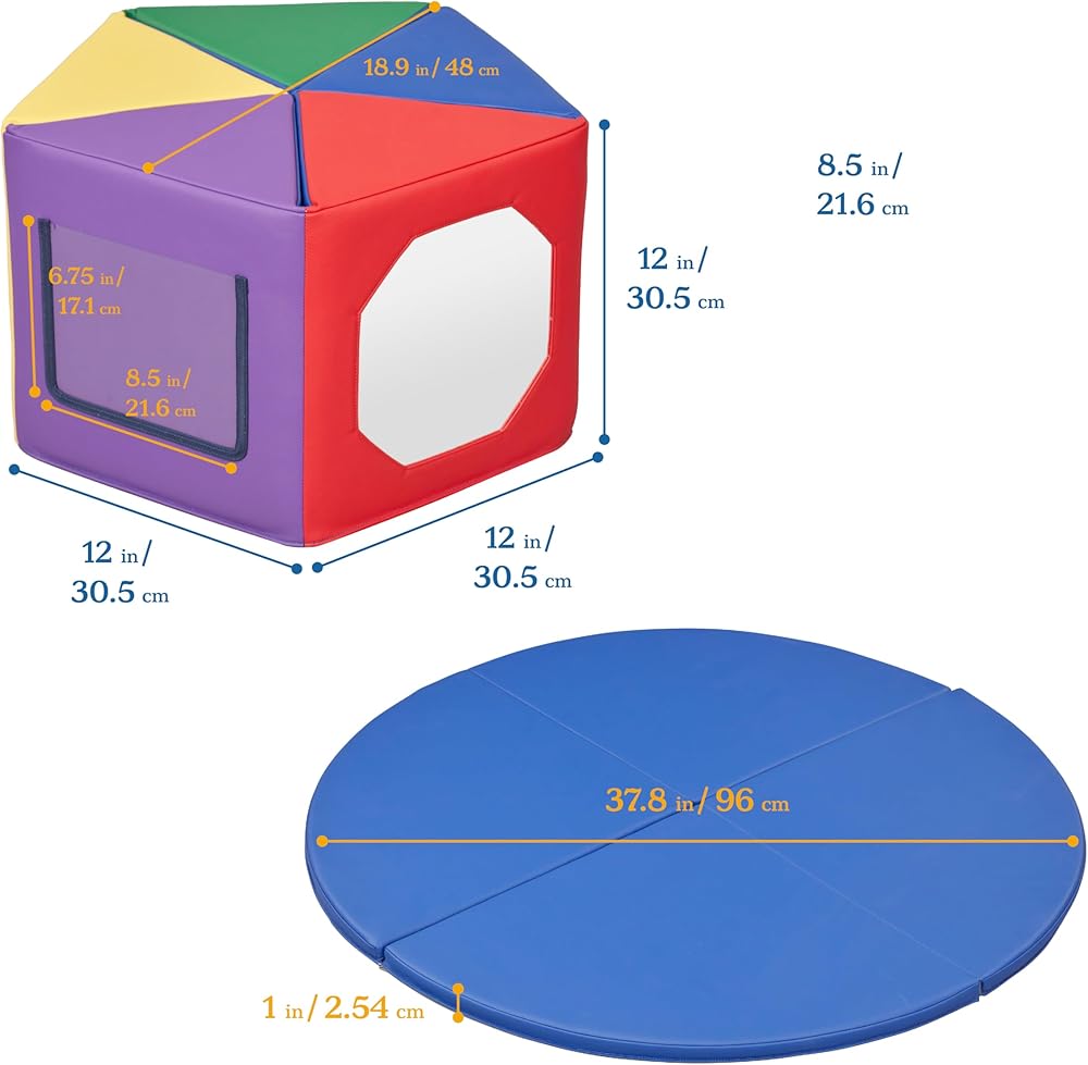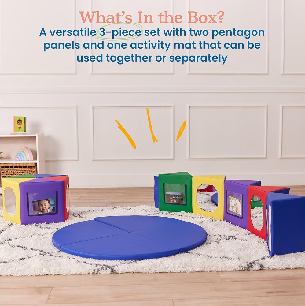 Spark your child's curiosity with ECR4Kids SoftZone Wall of Mirrors. This versatile three-piece set includes a round activity mat and two pentagon shapes with shatter-resistant acrylic mirrors and clear pockets. The sensory activity is ideal for tummy time in a daycare, preschool, or home. When used as a mirror center, the padded enclosed design creates a safe space for babies to explore, promoting special awareness. Practice sitting up, reaching, and crawling for gross motor skill development. Roll up the pentagon shapes and secure them with the attached hook and loop extension to create two play spaces with mirrors and pockets facing outward. Mirrors encourage self-recognition and provide visual stimulation, helping babies develop self-awareness as they recognize their reflections over time. Clear pockets allow for customization with family photos or learning materials. Seeing familiar faces supports emotional development and bonding and early educational materials like letters and shapes aid in early cognitive development. The foam core is covered in water-resistant polyurethane vegan leather with a durable woven backing and features a non-slip base for added stability. The baby activity center easily folds into compact pentagon shapes, and the 4-fold tummy time mat is perfect for space-saving storage.