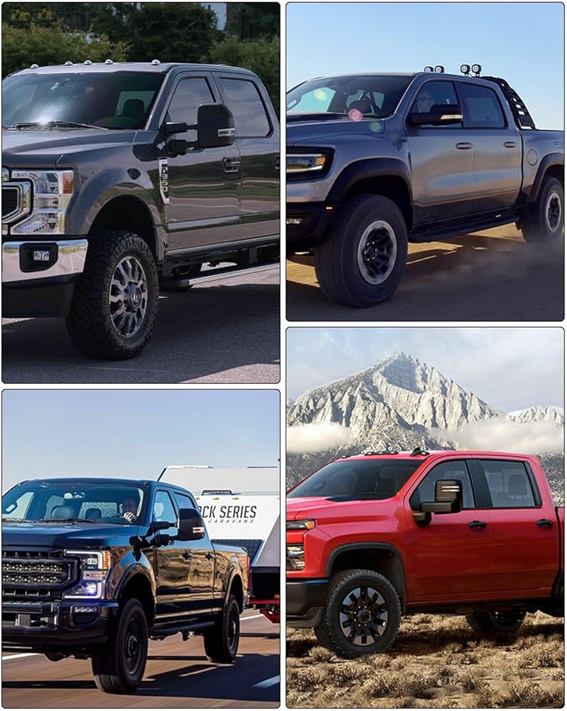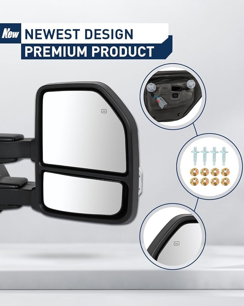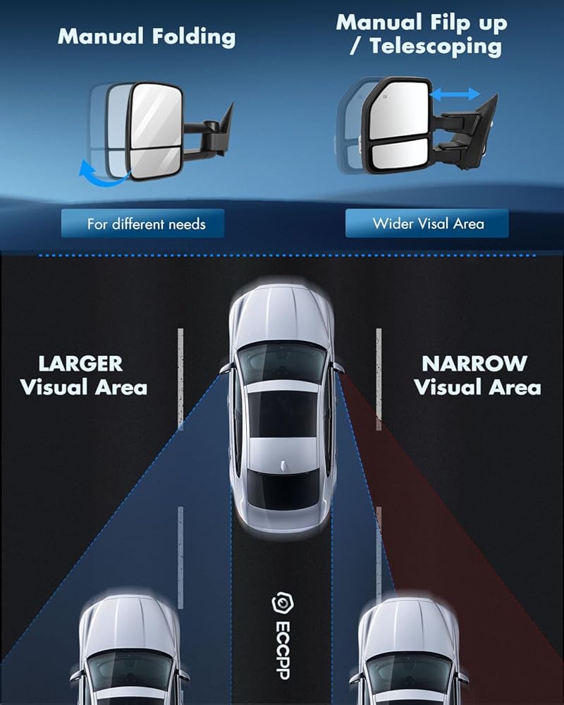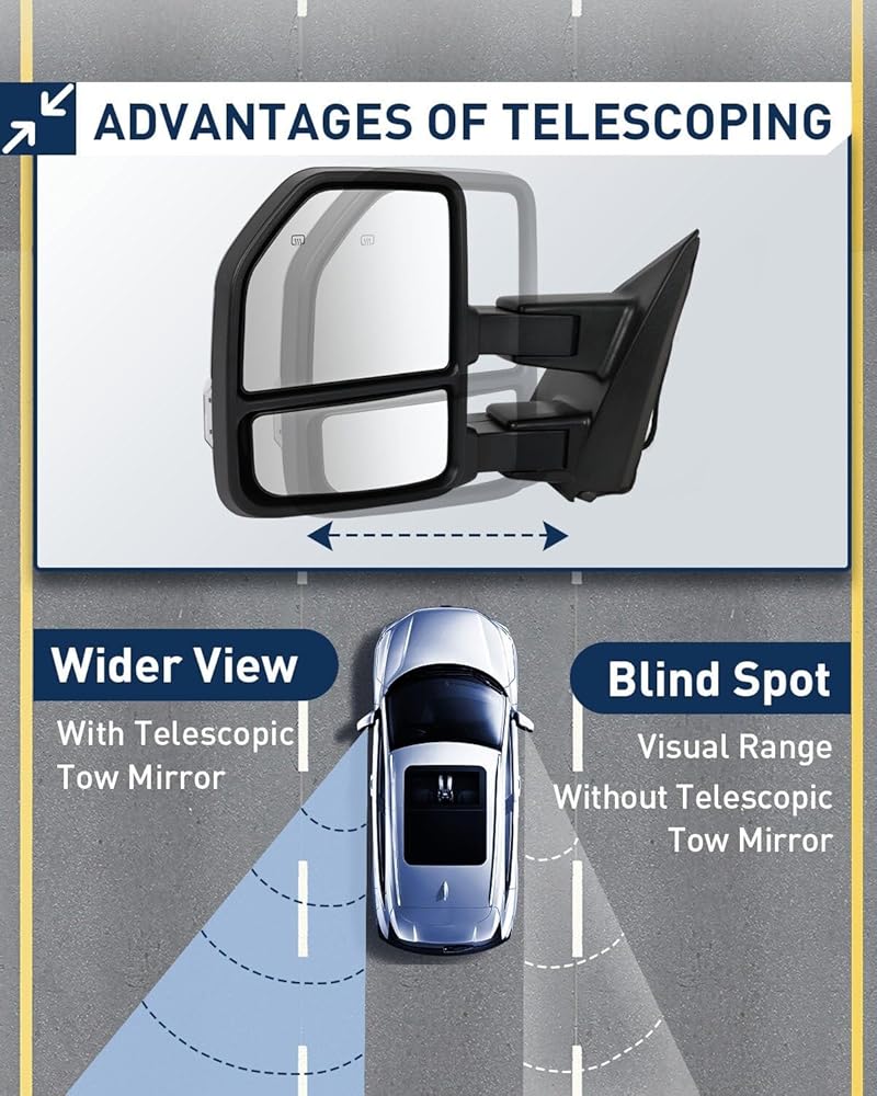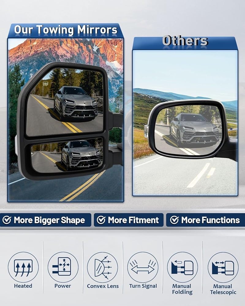 Multifunction Of Tow Mirrors - Choose from towing mirrors equipped with many different Functions: Power Adjusted, Heated, Turn Signal Light, Temperature Sensor, with Black Cap Housing, Manual Folding and Telescoping