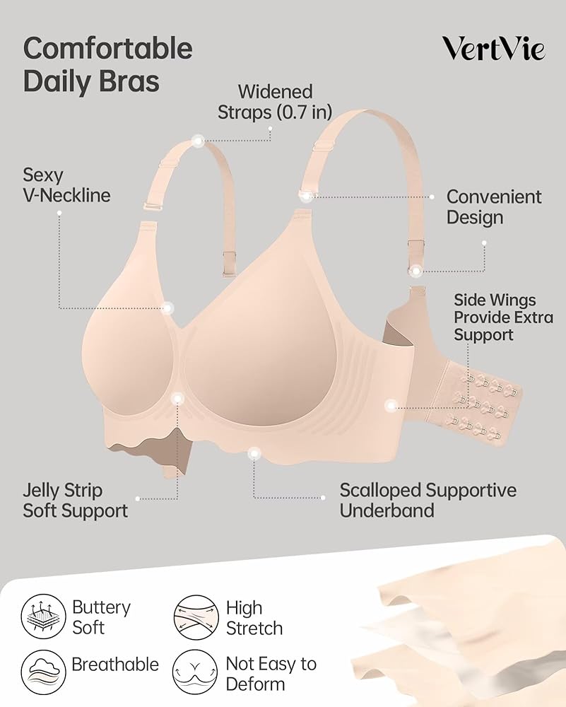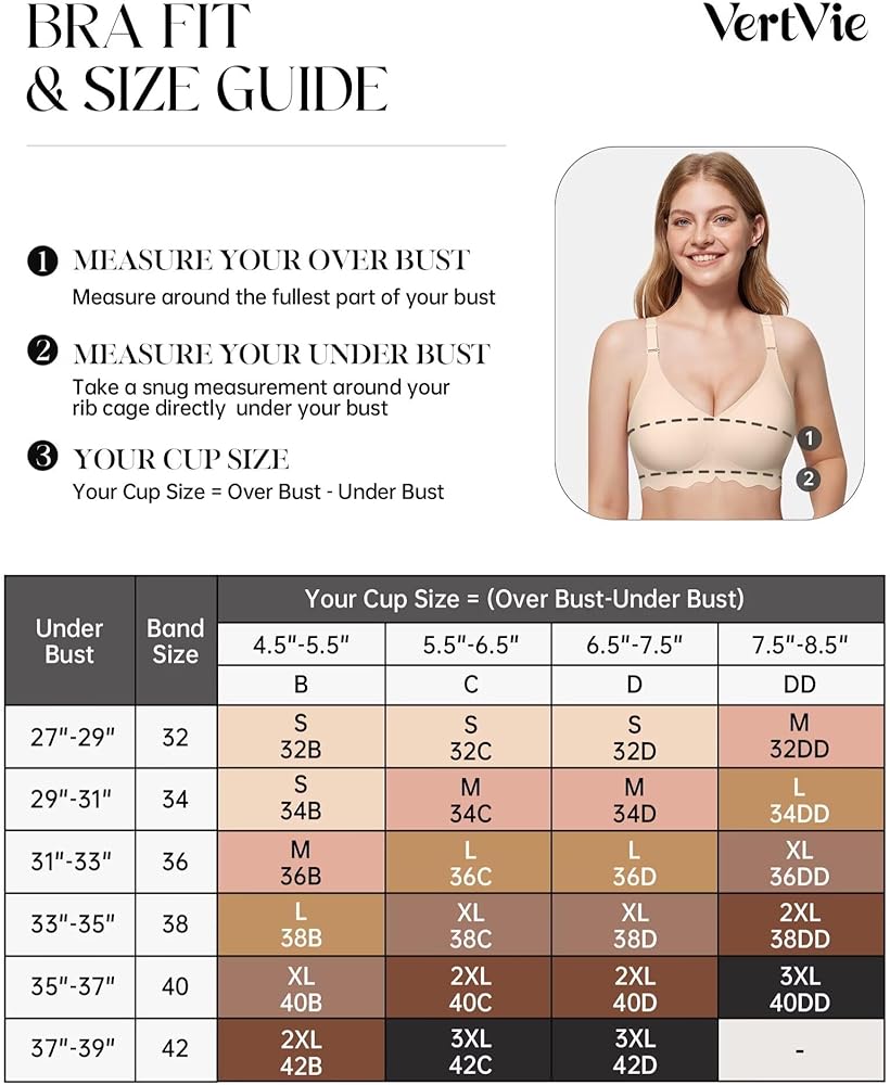 No Feeling Everyday Bra: You can wear it as an everyday bra, T-shirt bra, padded sleep bra, or light sports bra. The sizes available are as follows: S (32B, 32C, 32D, 34B); M (32DD, 34C, 34D, 36B); L (34DD, 36C, 36D, 38B); XL (36DD, 38C, 38D, 40B); 2XL (38DD, 40C, 40D, 42B); and 3XL (40DD, 42C, 42D). VertVie Bras are suitable for both younger and older women