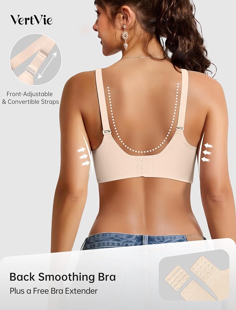 Back Smoothing Bras: These full coverage bralettes feature an invisible back closure design, with wider side wings that help hide underarm and back fat for a beautifully curvy silhouette. This padded T-shirt bra includes a four-row, three-hook closure for a customizable fit. Additionally, it comes with an extra extender for added convenience and flexibilit