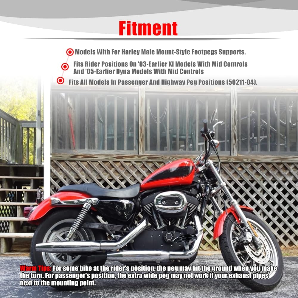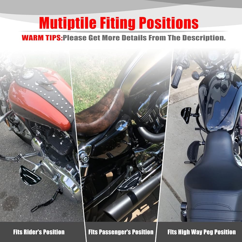Fitment: Fit for Harley models with male mount style foot pegs support.(Except the rider position on 2015-later XG, 2007-2010 XL883L, 2007-later XL883N, XL1200N, XL1200V and XL1200X, 2011-later XL1200C and XL1200T, 2018-later XL1200NS and XL1200XS, 2008-2013 XR and 2008-2017 FXCW, FXCWC, FXS, FXSB, FXSBSE and FXSE./ Except the rider and passenger position on 2018-later Softail models.