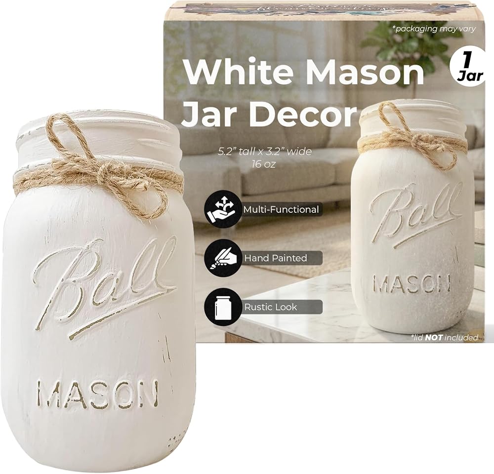 Small White Mason Jar Decor | 16 oz Hand Painted Distressed Pint Jar | 5 Inch | Rustic Farmhouse Decor | Pencil Holder for Desk | Pen Cup | Small Vase for Flowers (White Jar - No Flowers)