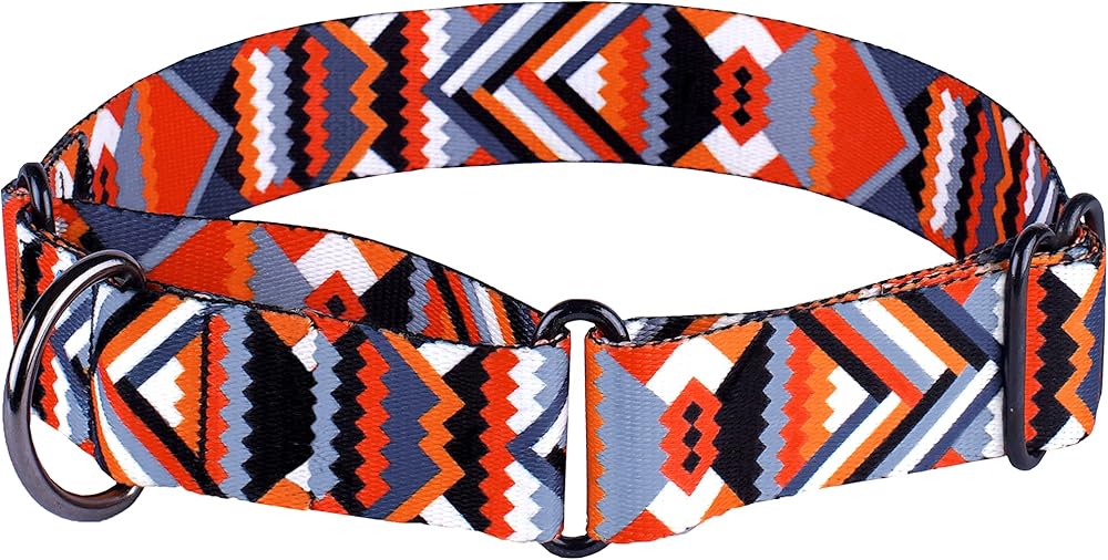 Our martingale collar combines high quality and unique vibrant design. This dog collar is made of print nylon. Martingale collars are available in 4 patterns: Scandinavian, Aztec, Geometric and Tribal. Our collars are available in 3 different sizes: M - Neck Size 12"-17", L - Neck Size 15"-20", XL - Neck Size 19"-24". When your dog pulls, the small loop constricts and creates tension, allowing you to correct your dog's behaviour without using a choke chain. This martingale dog collar is great for training and walking. It's a great gift idea for any dog lover. Please measure your dog's neck with a soft measuring tape to choose correct size.