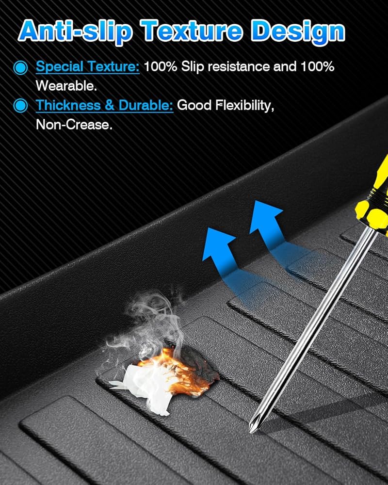 【Built for Protection】The groove design of the cargo tray, forming channels to collects water, mud, snow, debris, ect, with the raised edge to avoid leakage, providing all weather protection. The anti-slip texture also helps prevent cargo from moving when driving, protect your car's trunk.