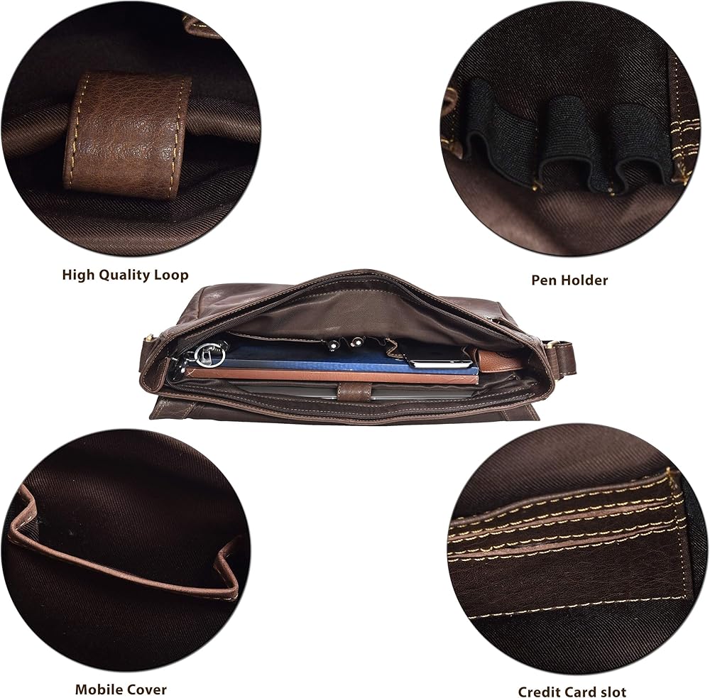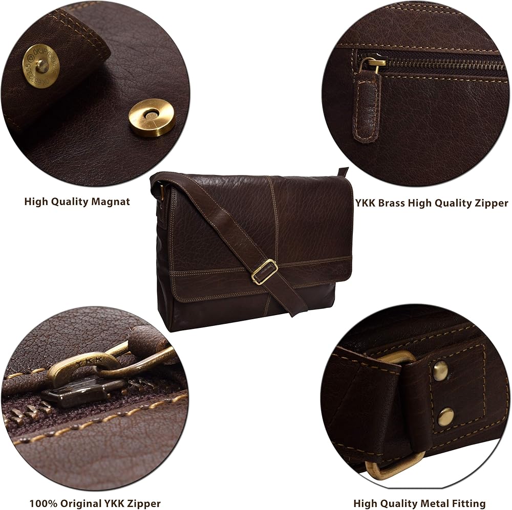 Durable Hardware & Zippers: Built to last, this leather messenger bag for men includes strong zippers and metal fittings, combining functionality with a sleek look for work, college, or travel.