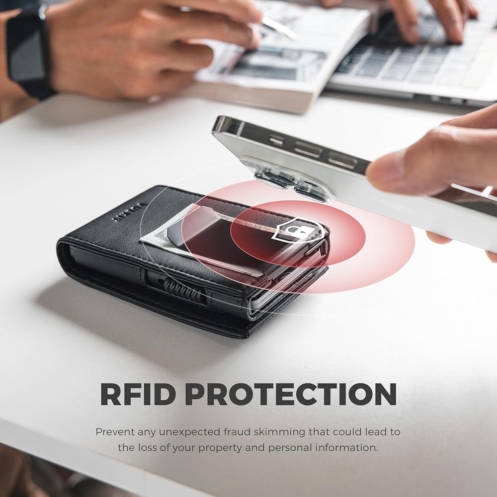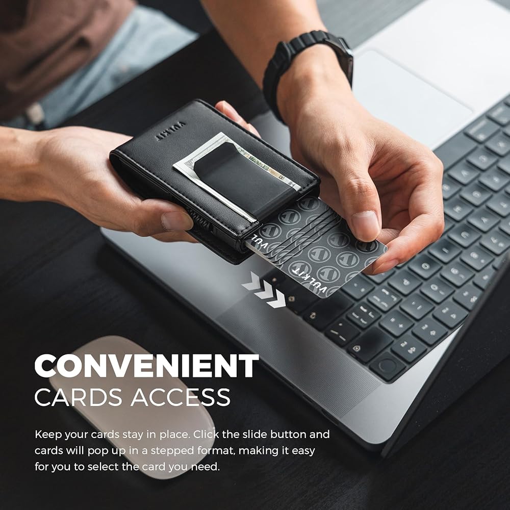 【Quick Cards Access】Easily press the button on the side and the mechanics will allow your cards to pop out neatly in a stepped shape, making it easy to pick the card you want. Place the card back into the holder after use and your card will not fall out. Recommended for 1-5 standard size credit cards.