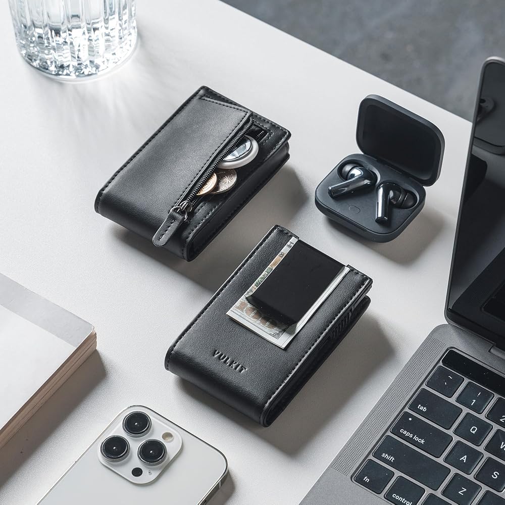 【Functional Bifold Wallet】This wallet carries everything you need for your daily outings. It has a money clip for cash, 2 ID windows in the center of the leather case, a metal card holder for 5 credit cards, and a zippered pocket for coins, sim cards and AirTag.