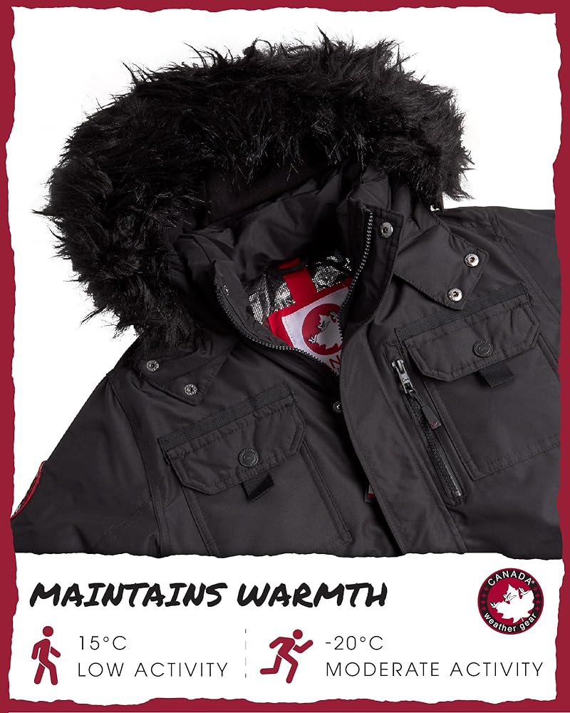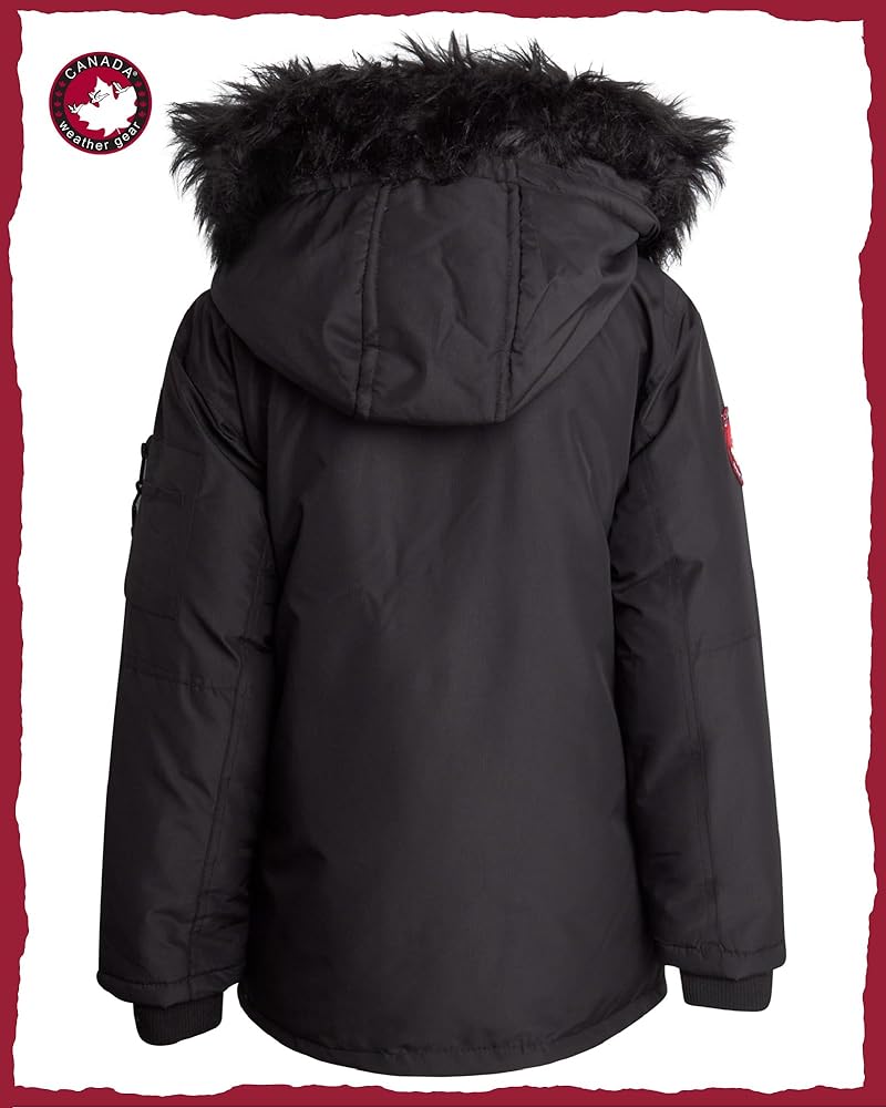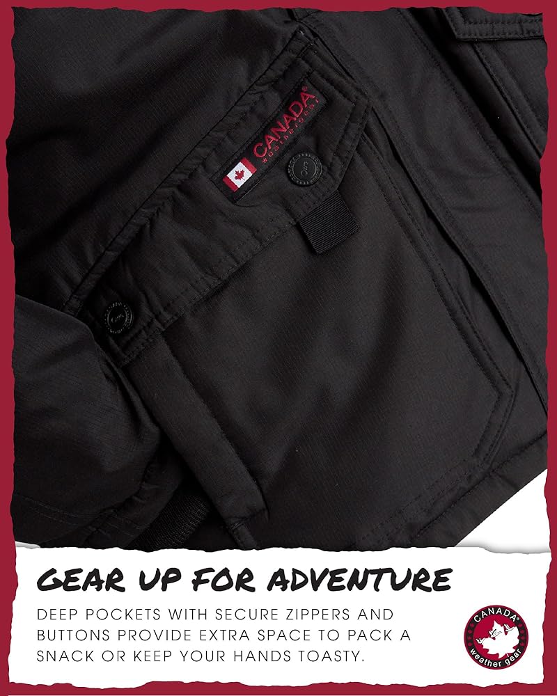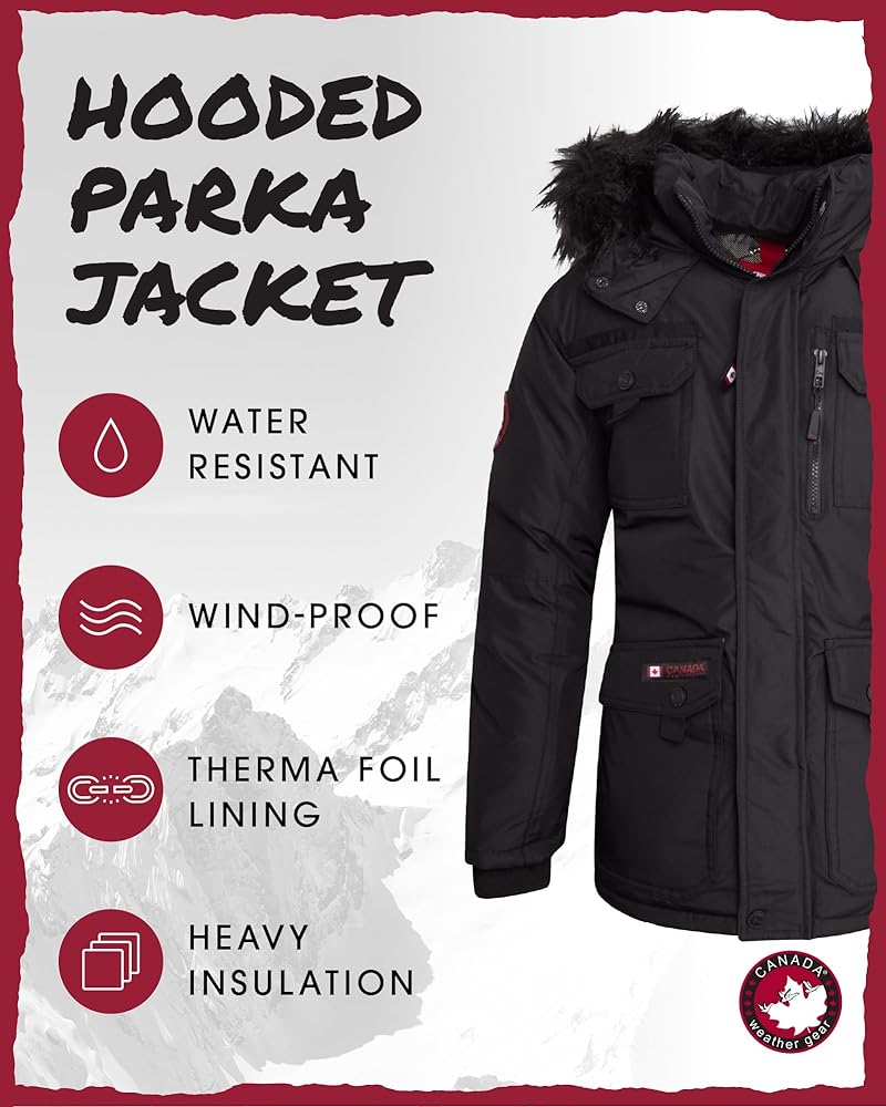 When the temperature drops and the snow starts falling, you need a winter coat that keeps up with your boy's active lifestyle. The Canada Weather Gear Boys' Heavyweight Hooded Parka is built for cold weather adventures, providing the warmth, durability, and style your son needs to stay comfortable and confident in any setting. Crafted with high-quality water and wind-resistant materials, this boys' winter jacket shields against harsh winds and unexpected snowfalls. The heavyweight insulation and lining trap body heat, creating a cozy barrier against freezing temperatures, whether he's walking to school or enjoying a snowball fight with friends. Rated for low activity in 15°C to moderate activity in -20°C, this ski jacket ensures your son stays warm no matter how low the thermometer dips. Thoughtful details make this kids' winter jacket both functional and stylish. The faux fur-trimmed hood not only adds a trendy touch but also provides extra protection against cold winds. The detachable fur trim allows for a customizable look, adapting to different weather conditions and his personal style. Deep, secure pockets with zippers and buttons offer ample space for stashing gloves, snacks, or small essentials, keeping his hands free for winter adventures. This parka is more than just practical; it's a statement piece that combines the timeless parka design with modern flair. Whether your boy is on the slopes or strolling through the city, this winter coat for boys offers a polished yet rugged look that pairs perfectly with any outfit. Its durable construction ensures it holds up to the rough and tumble of outdoor play, making it a reliable option for years to come. Designed with boys in mind, this snow jacket offers a comfortable fit and freedom of movement, so he can stay active without feeling restricted. From family ski trips to daily errands, this boys' outerwear jacket provides unmatched versatility, making it a go-to choice for parents and kids alike.