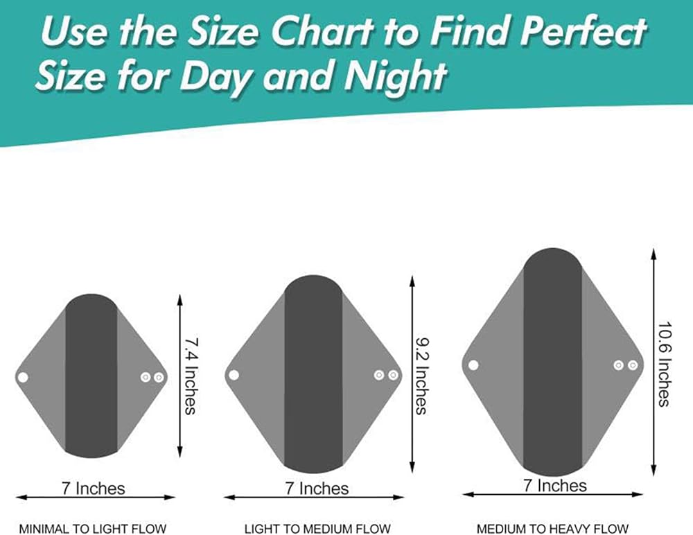 3 Size Available - Washable mentrual pads Small size 7.4inches Length X 7inches Width (including wings) ; Medium size 9.2 inches Length X 7.2 inches Width (including wings) ; Large size 10.6 inches Length X 7.2 inches Width (including wings).