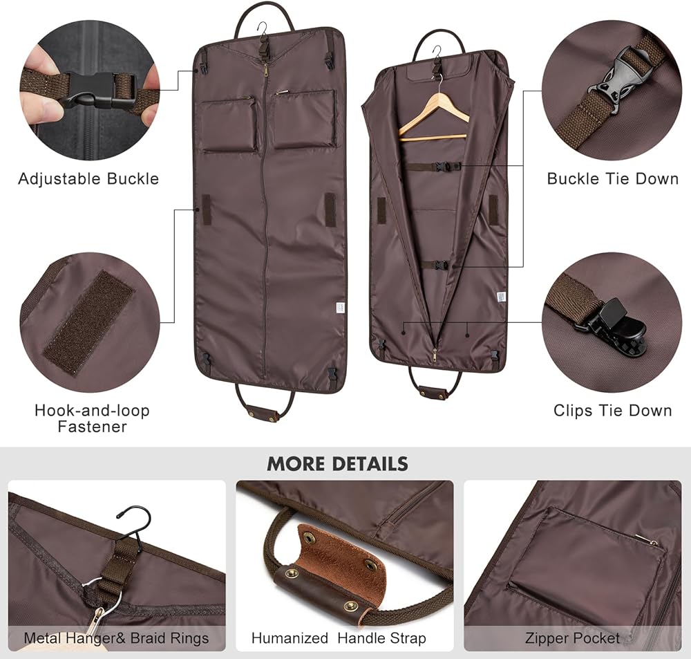 Water-resistant Pocket: This convertible garment bag is made of durable, lightweight, soft canvas. On the Main inner pocket, high-density water-resistant material can help you reduce the penetration of your items by wet items