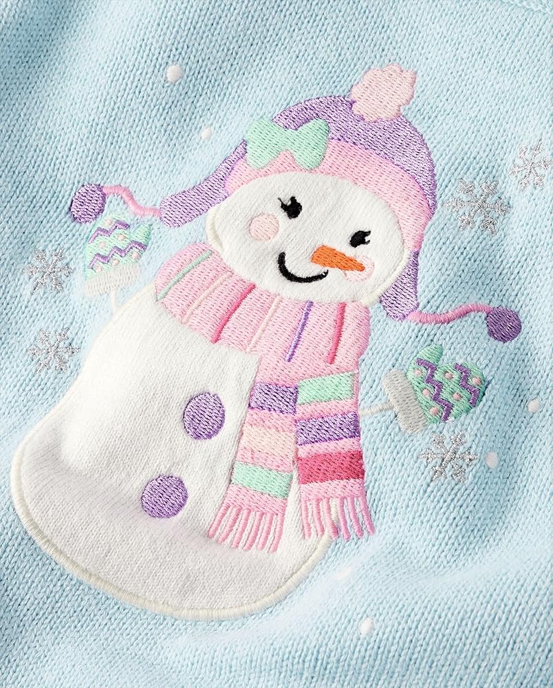 FEATURES: Snowman wearing hat, scarf and mittens graphic, faux jeweled buttons