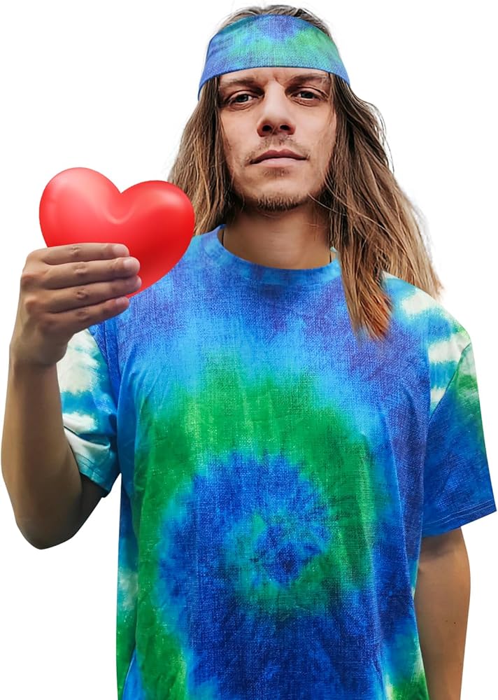 Fun hippie combo: vibrant tie dye T-shirts with a soft touch, suitable for both men and women; Hippie handkerchiefs can be used as headbands, hats, scarves, and wrists; Wear a peace necklace and attend holiday gatherings.
