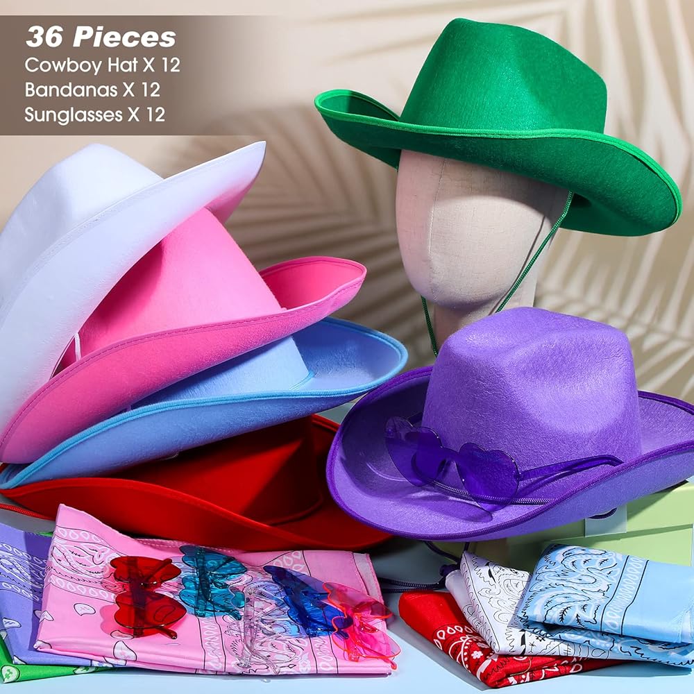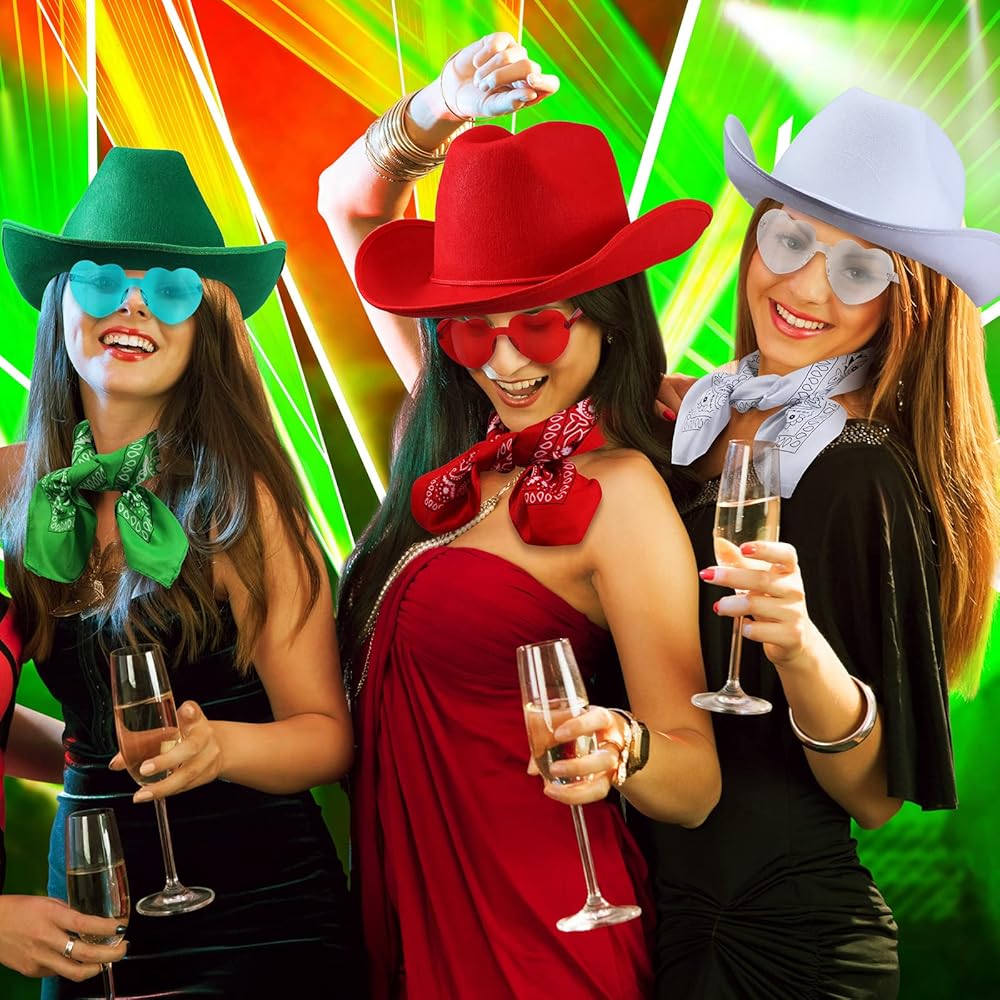 What You Get: you will get 12 cowboy costumes sets, including 12 pieces of cowboy hats, 12 pieces of cowboy bandannas and 12 pieces of heart sunglasses, classic style and sufficient quantity to meet your use or replacement needs; They are nice for parties or dress up