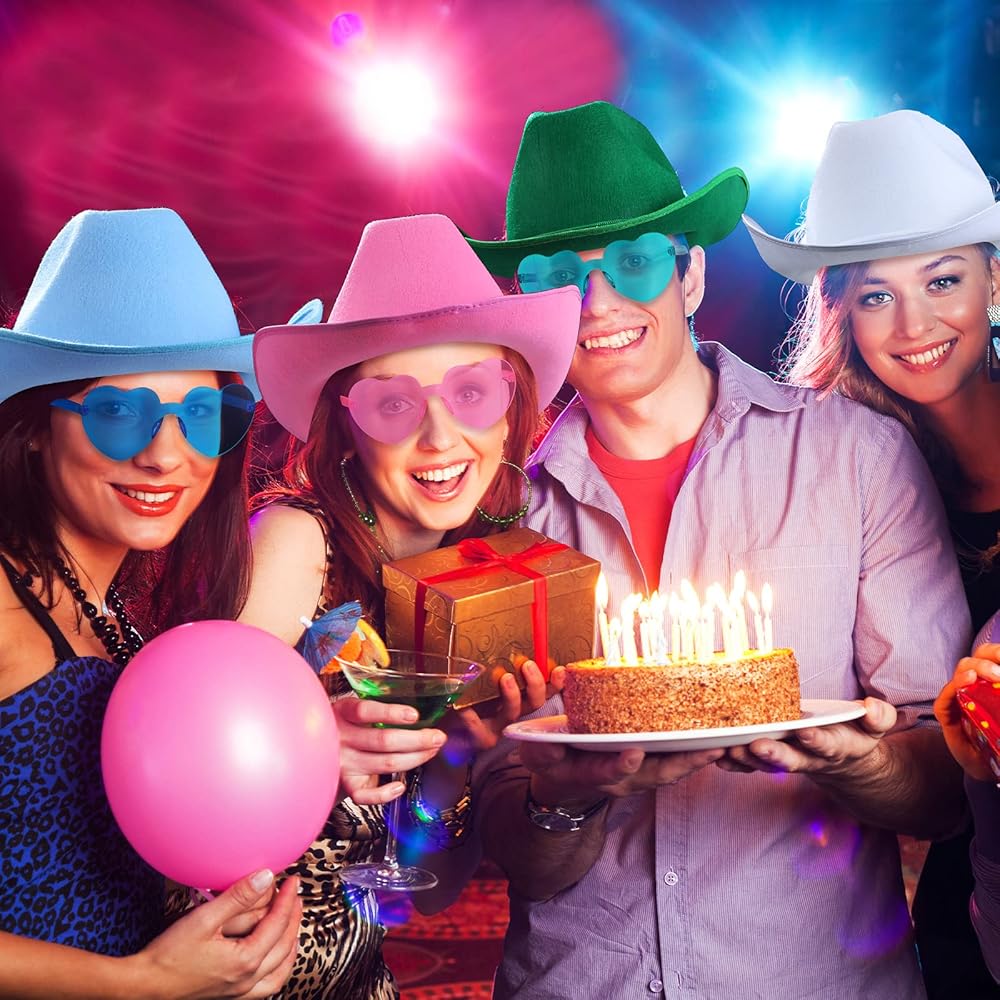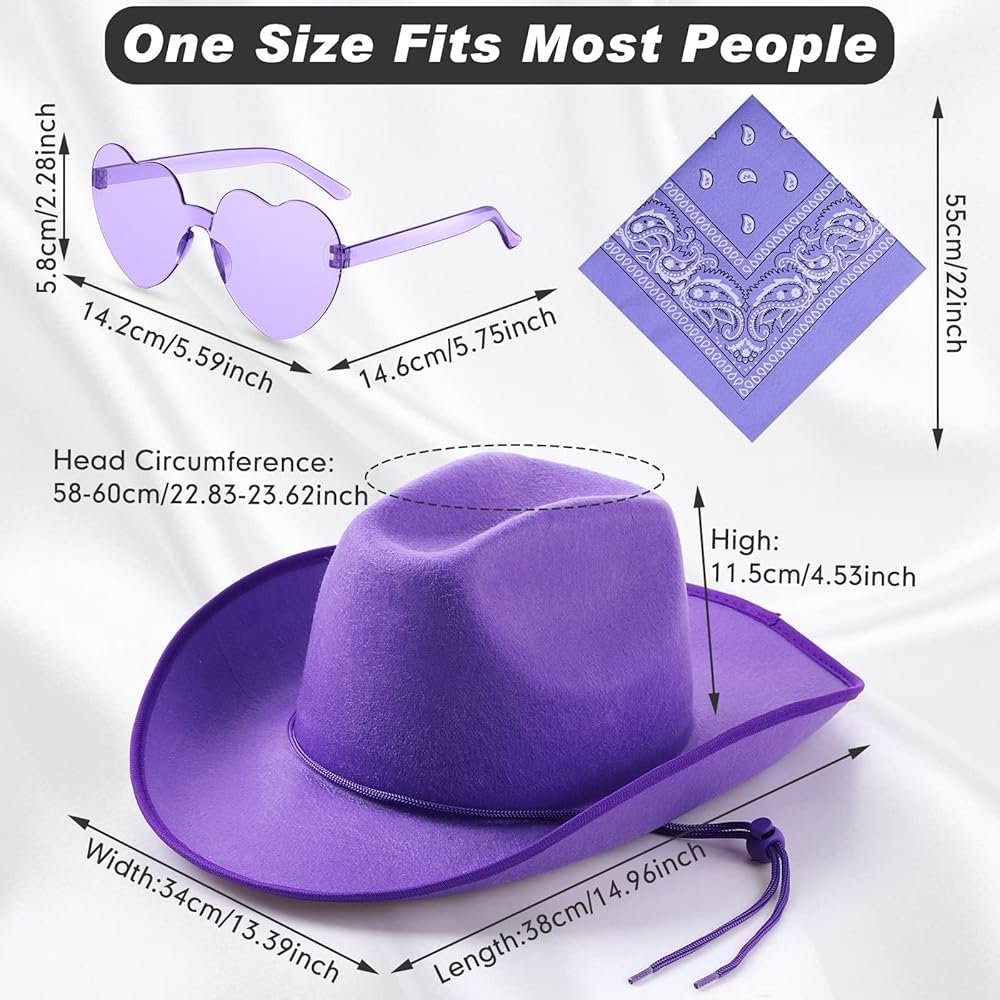 Suitable Size: our men women felt cowboy hat is about 14.96 x 13.39 x 4.53 inches; Cowboy bandanna is 21.65 x 21.65 inches; The heart sunglasses is 5.59 x 2.28inches; They are all available in universal sizes that fit most people and is suitable for both men and women