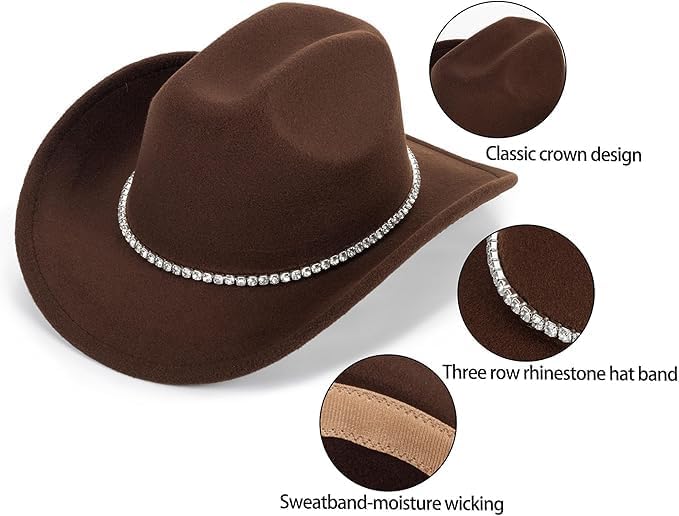 Vintage Western Cowboy Hat and Cowgirl Hat for Women and Men (Teens & Large Kids) The Cowboy Hat Made of 65% cotton and 35% polyester Felt Blend Great for Western themed parties, rodeos, and Halloween Cowboy costume men dress up & cosplay accessories, preppy cowgirl costume for women, Sparkly Disco Bachelorette Party, Western Wedding Dress up . As a legendary and enduring symbol of American culture, the western cowboy has always been synonymous with valor and wildness. In the TV series "Westworld" footage, filled with the wild west cowboy style. The cowboy flavor of the Wild West. We believes that many adventurous friends must be eager to experience the style of western cowboys. Please Note: The color may vary slightly from the online due to monitor color settings."