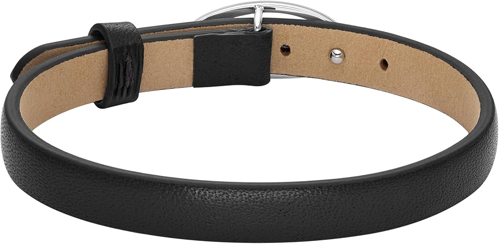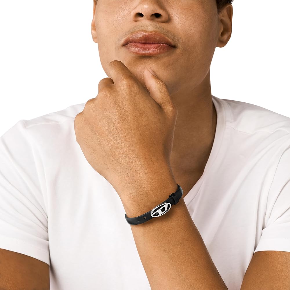 Diesel's stackable bracelet features black leather and a button stud closure.