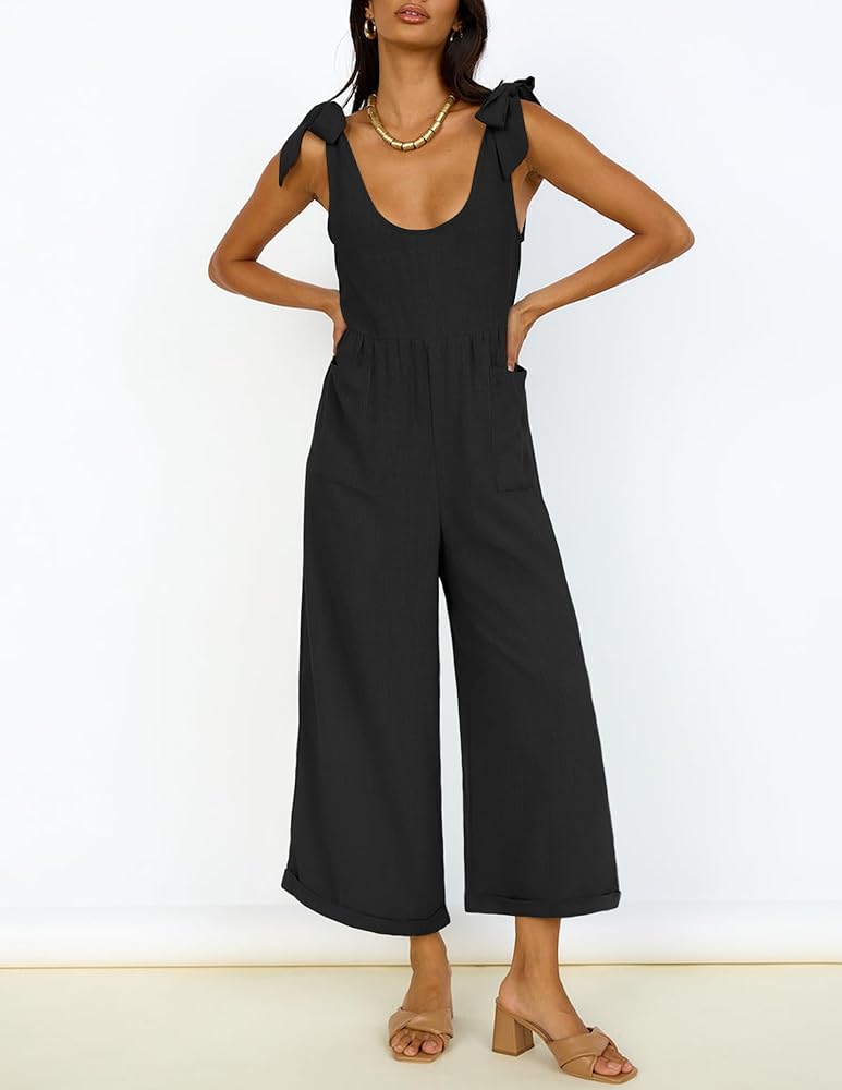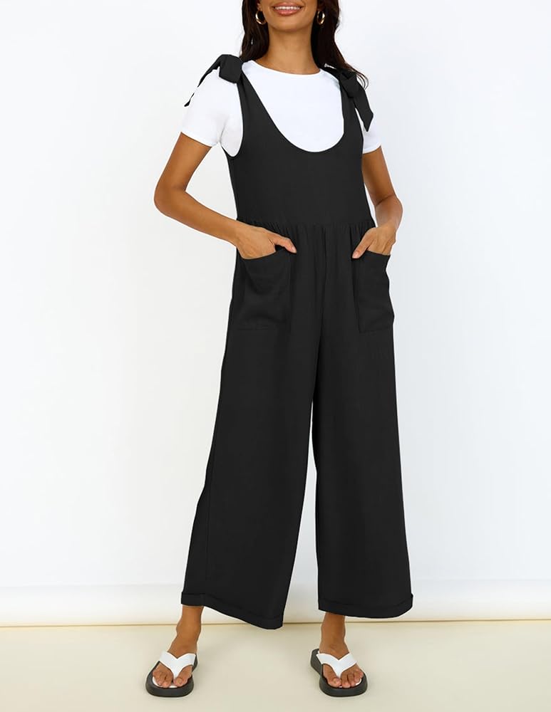 Casual loose jumpsuit features a cute u neck, lounge sleeveless with adjustable straps, classic solid color, unlined, loose fit, wide leg pants matches two pockets, one piece design, easy to put on and take off.
