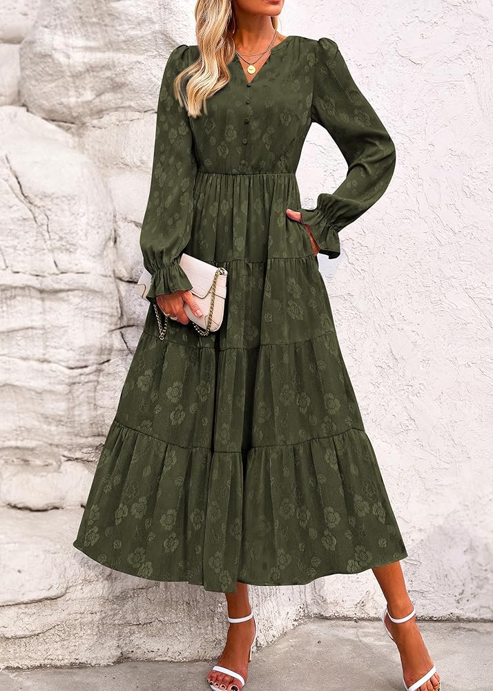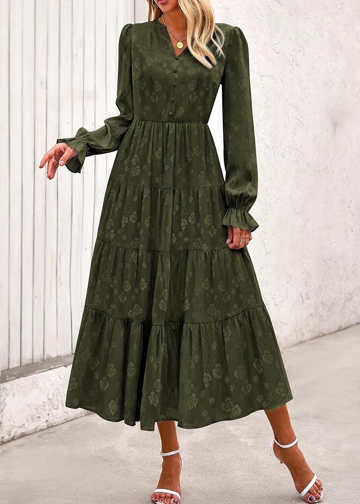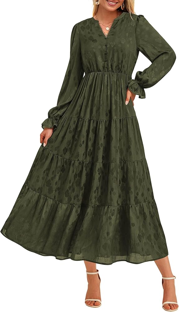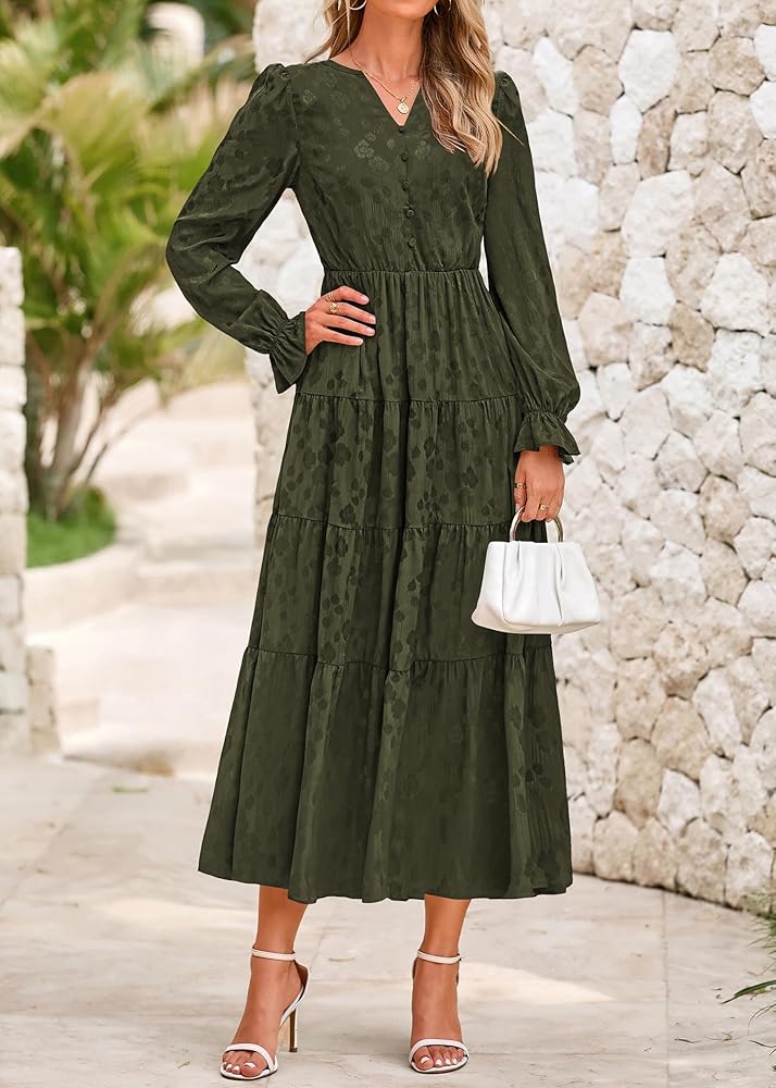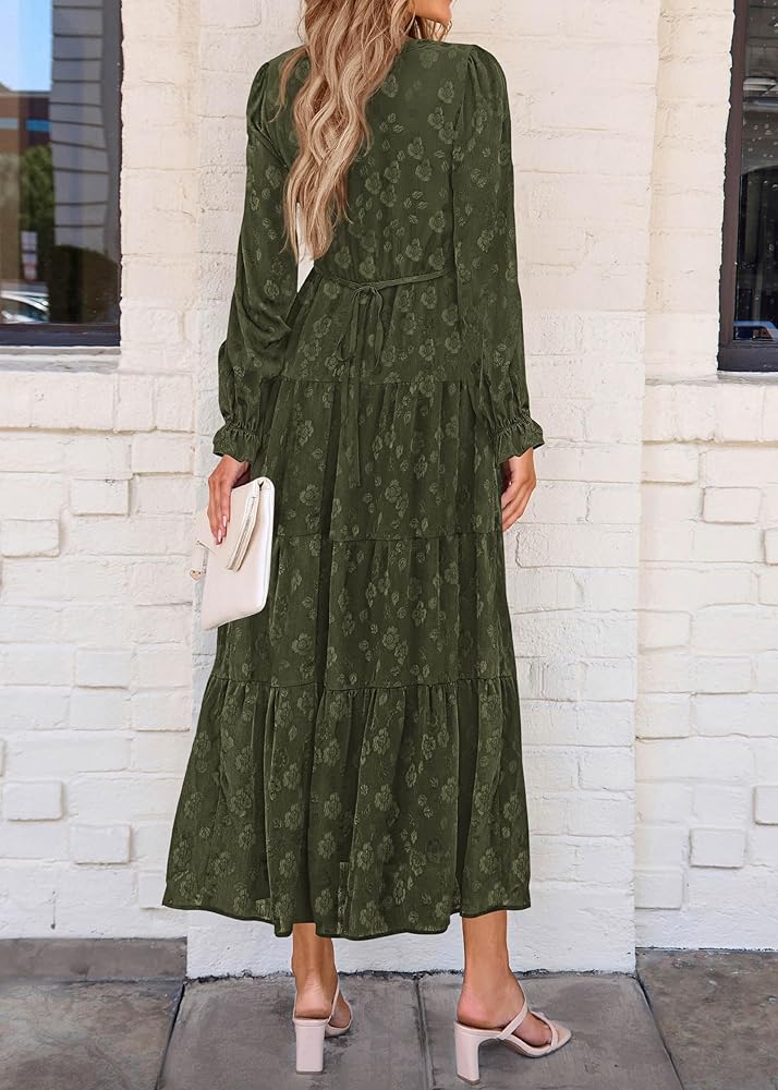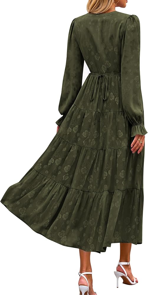 Features: Fall Dresses For Women 2024/ Long Sleeve Maxi Dress/ Wedding Guest Dress/ 5 Front Decorative Button/ Elastic Waist with a Back Belt/ Ruffle Elasticated Cuff/ Elegant V Neck/ No Stretchy/ Floral Jacquard Fabric/ Lined and 2 Side Pockets/ Tiered Swing Hem/ A Line/ Flowy Long Dress