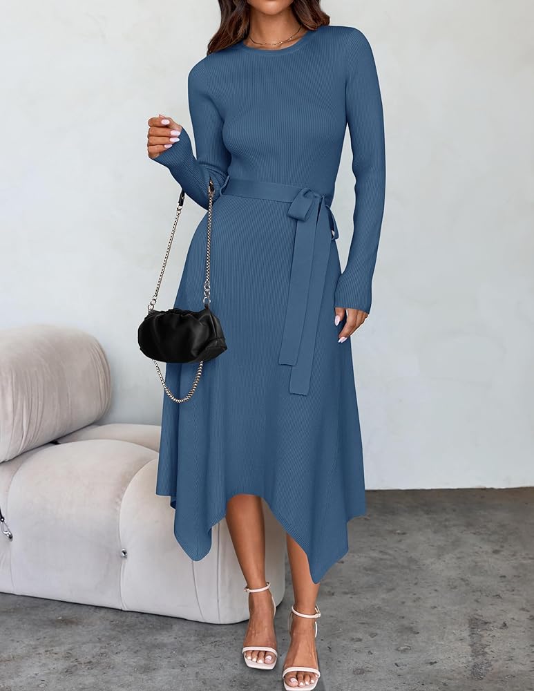 Our exquisite women's knit dress, a must-have addition to your wardrobe. This crew neck, long sleeve dress is designed with its A-line silhouette, self-tie waist, and midi length. The irregular hem adds a touch of uniqueness, making it stand out from the crowd.