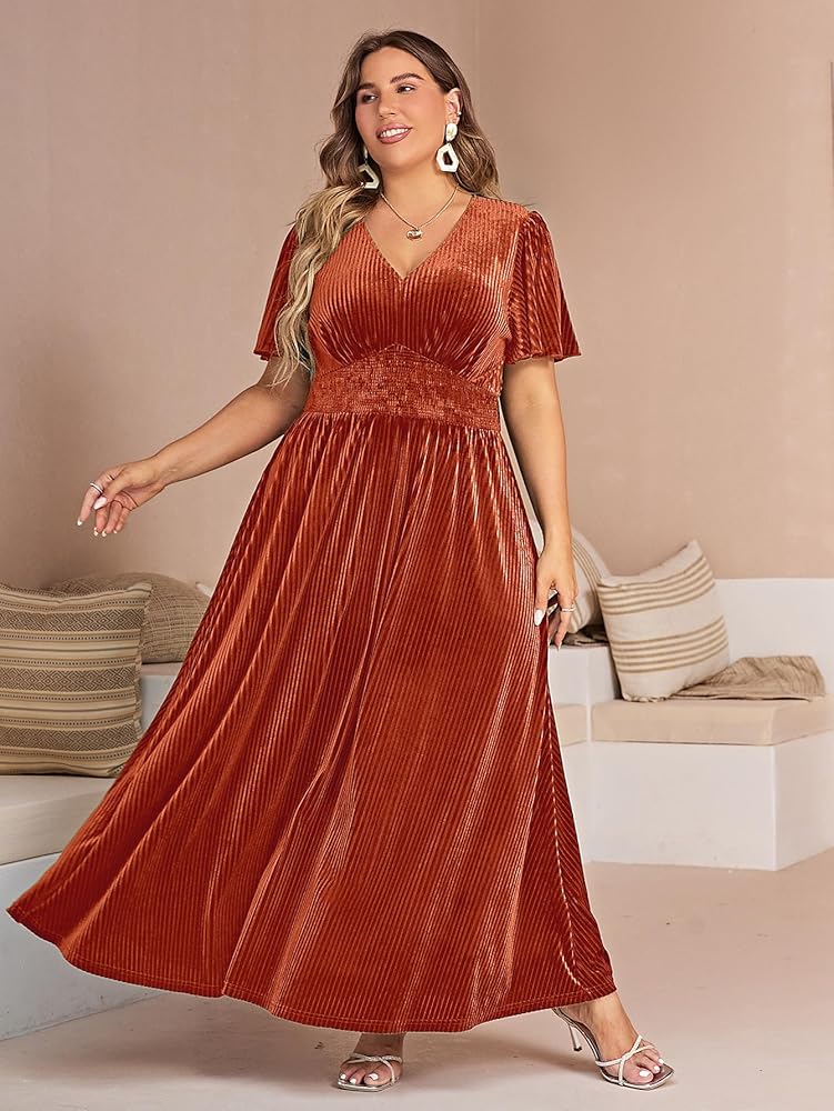 💝VELVET MAXI DRESS: Velvet Short Flare Sleeve Semi Formal Maxi Dress is made of 95% polyester, 5% elastane, which is more soft, breathable, light, stylish and smooth for your daily wear or formal party wear. The V neckline shows off your beautiful collarbone and the empire elastic high waist is designed to fit your waist better and make your figure look more perfect, hides the small belly. The great elegant classic A-Line, flare ribbed sleeves and hem accentuate your appeal.