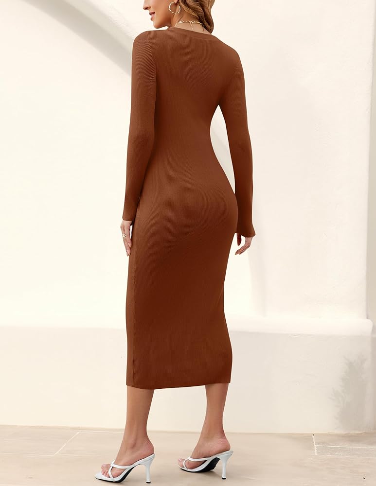 Features:open front button,v-neck,split hem,soild color,ribbed knit sweater dress,long sleeve,bodycon sweater dress,below knee length,2024 fall winter trendy dresses,causal dress,slim fit sweater dress,elegant maxi long dress.