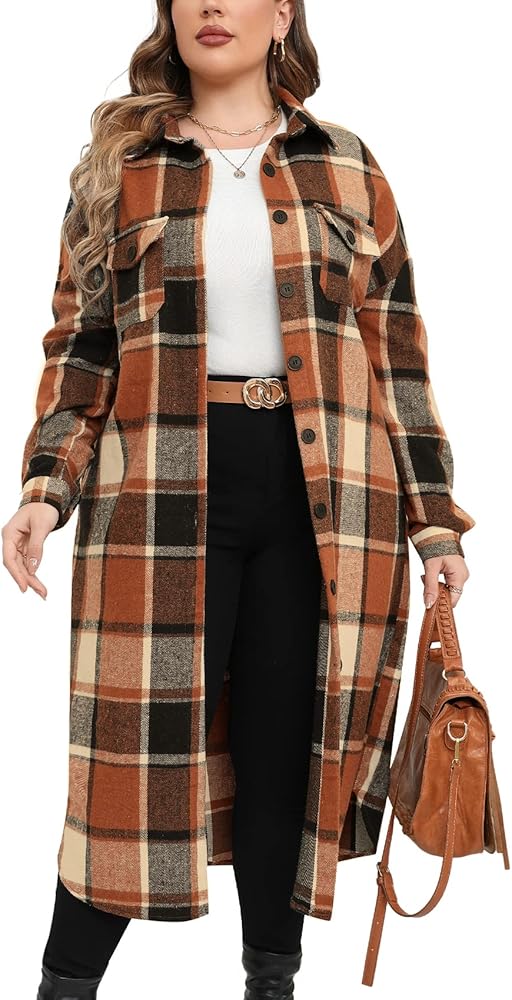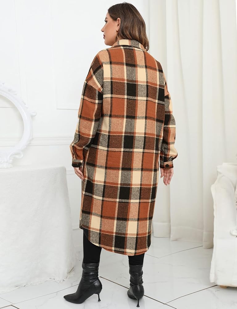 Calf-Length Chic: The calf-length design of our plus-size shacket adds a touch of sophistication to your ensemble. Crafted with plus-size individuals in mind, our long flannel shirts offer a comfortable and stylish fit tailored to your body type.