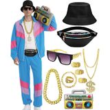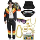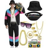 13PCS Suit: 80s 90s outfit for men includes 1 × Jacket,1 × Jogger,1 × Hat,1 × Sunglass,4 × Ring,1 × Dollar Necklace,1 × Gold Necklace,1 × Bag,1 × Balloon Radio,1 × Bracelet.A variety of 80s accessories to meet your needs, making you stand out from the crowd