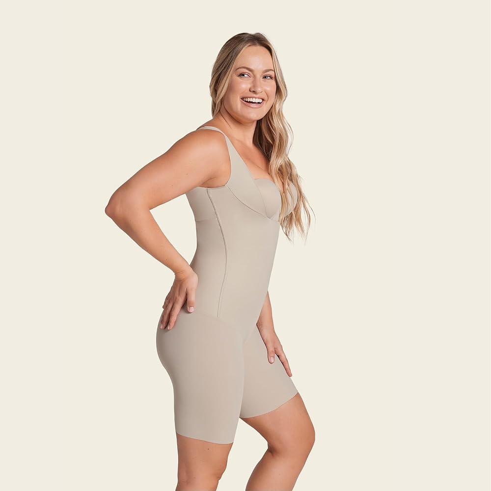 This mid-thigh bodysuit shaper is made with our trademark DuraFit fabric for firm compression to sculpt the whole torso and thighs. Double-layered fabric in the torso carves out your curves, while the single-layered short bottom shapes lightly while preventing thigh rub. Laser-cut edges give this shaper a truly undetectable look, even under your tightest clothes. The plunge back is specially designed to shape the sides of your back while remaining undetectable, even when worn with scoop back dresses. The open bust design lets you wear your own bra, plus the front is specially designed to add a little extra bust support. The strategic ruched center seam in the back is designed to give you a natural butt-lift effect.