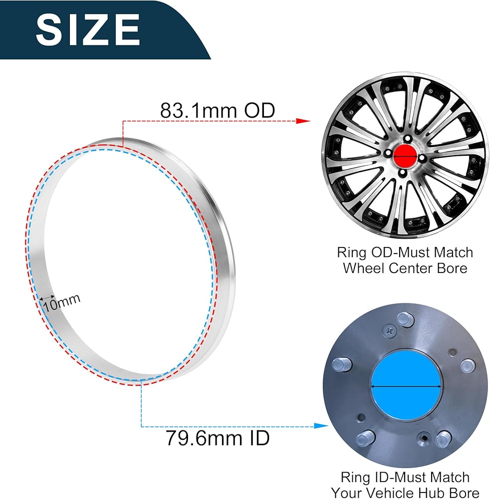 Specification:Wheel Centerbore Hubrings fit for wheels with OD 83.1mm center bore and vehicles with ID 79.6mm hub bore. Thickness: 10mm; Designed with the same wheel ID and hub OD for precisely fit.