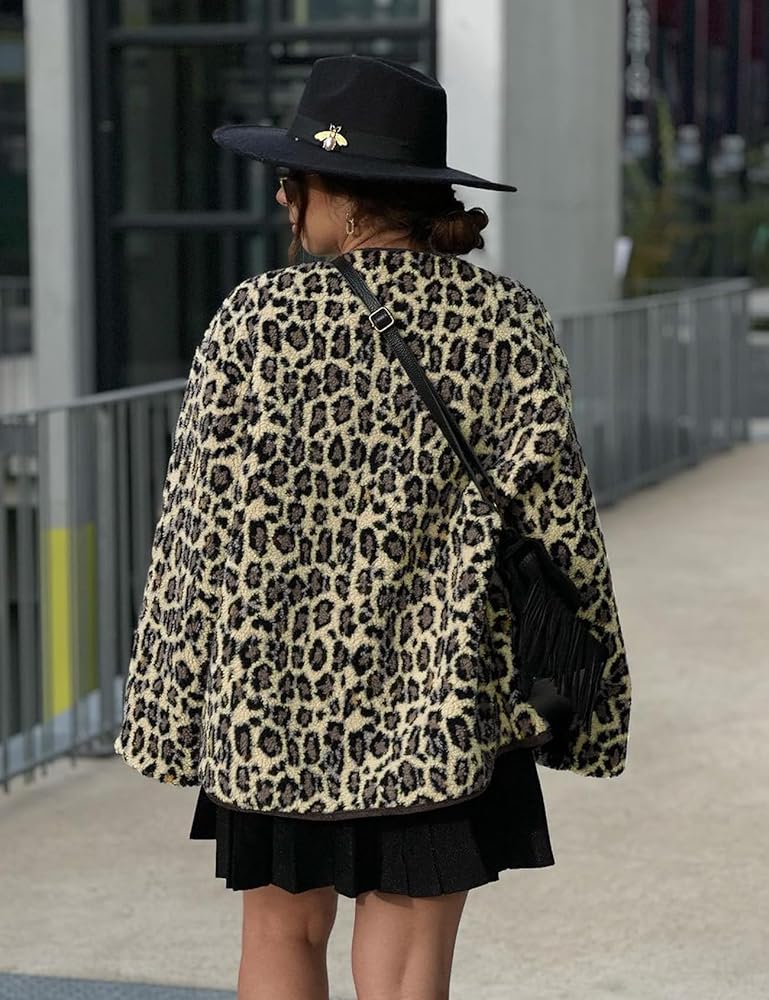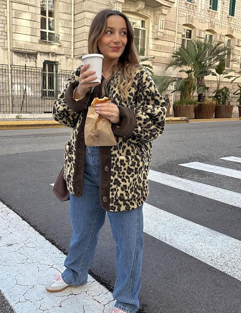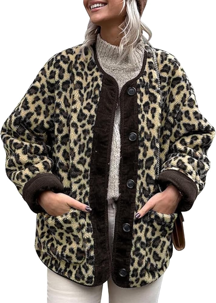 Womens Fleece Jacket Design: Lively cheetah printed, fuzzy sherpa jacket, drop shoulder, loose fit, hip length, two side pockets, cuffs and placket section are all in soft corduroy patchwork for a trendy look, leopard print jacket women. With its distinctive pattern and color, this jacket allows you to stand out in a crowd and showcase your individuality and fashion sense