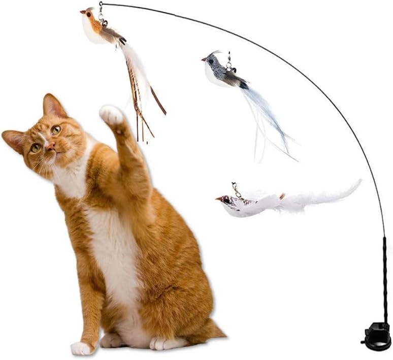 PREMIUM MATERIALS: This toy has 5 parts: a powerful suction base that can withstand any cat's play; a long wire (35 inches) to cover a lot of play space and give your cat a great workout; 3 cute replacement birds made with natural feathers that are lightweight and soft.
